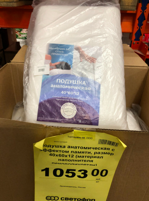 В продаже анатомические подушки с эффектом памяти. Наполнитель — memory foam, который подстраивается под форму головы и шеи, чехол выполнен из хлопка. Размер подушки 40×60×12 см. Производство российское, город Чебоксары. Цена — 1053 рубля.