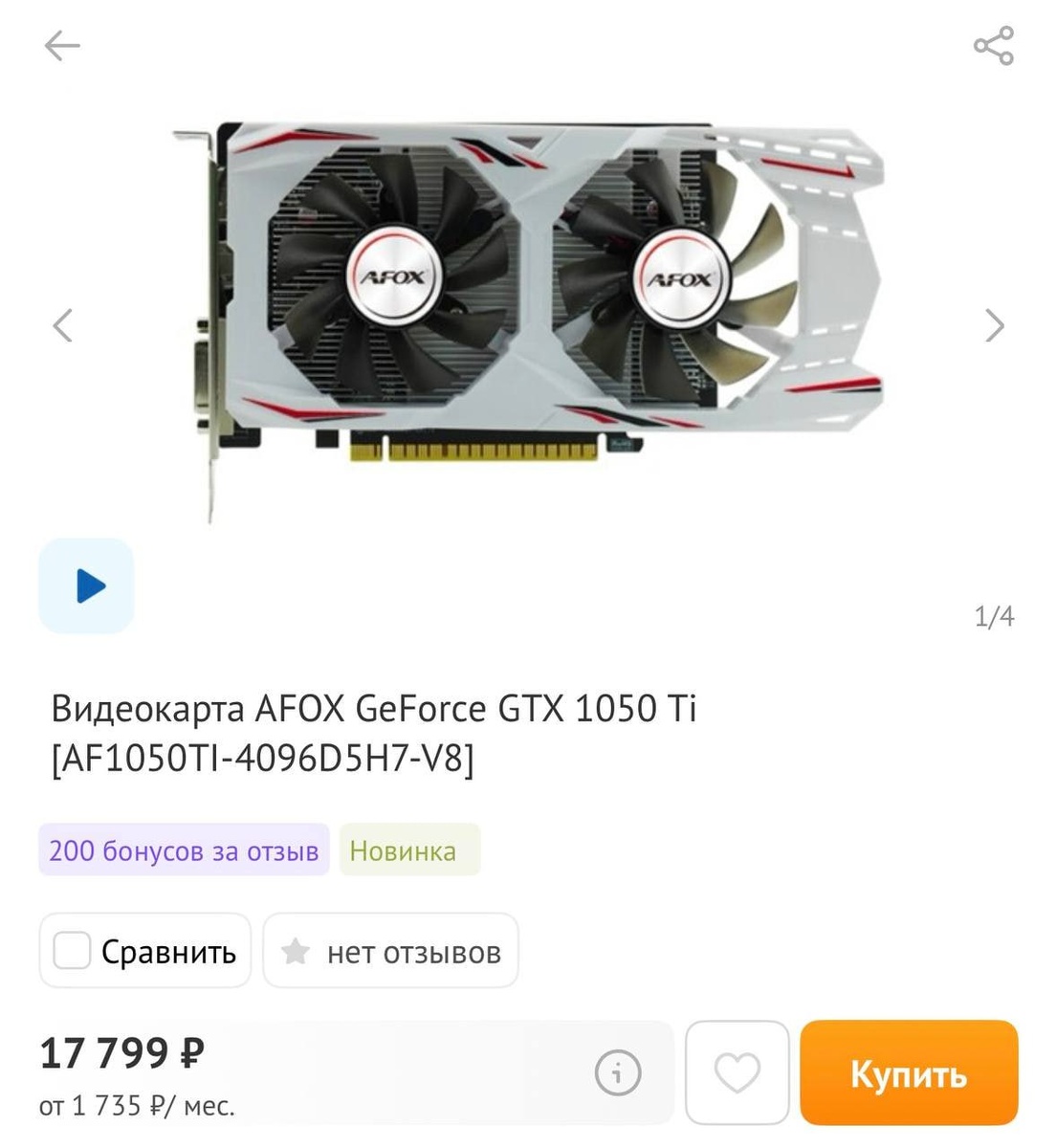 На рынке появились видеокарты NVIDIA GTX 1050 Ti образца 2016 года с двухвентиляторной системой охлаждения по цене 17 800 рублей. Для сравнения, современные GeForce RTX 3050 с 6 ГБ видеопамяти стоят от 20 000 рублей. https://dzen.ru/id/5c0e38ff46ef5c00aaa80527