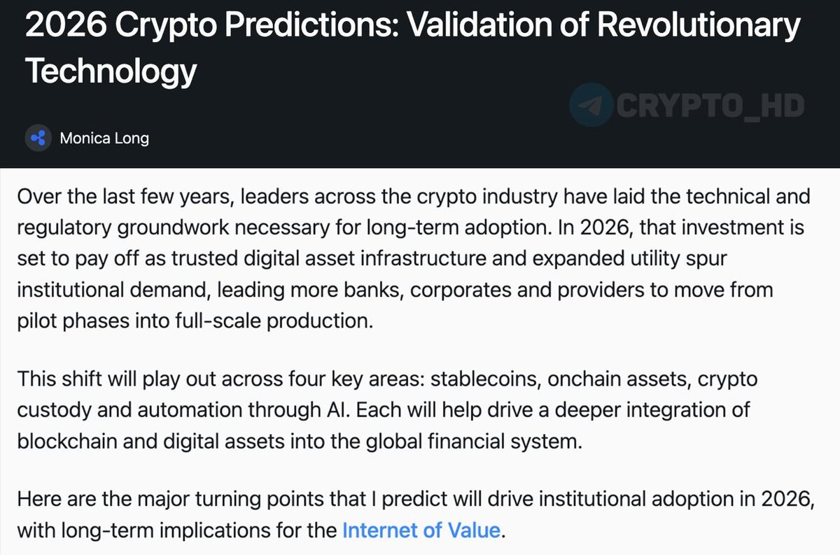 Президент Ripple считает, что криптовалюта окончательно станет частью глобальной финансовой системы. Ключевые прогнозы Моники Лонг: Стейблкоины. ➥ Стейблкоины станут базовой инфраструктурой глобальных расчетов, а не альтернативой традиционным платежным рельсам. ➥ В США уже стартовала эра цифрового доллара после принятия закона GENIUS. ➥ Регулируемые стейблкоины, включая RLUSD, станут стандартом для 24/7 платежей и обеспечением на финансовых рынках. ➥ Главный драйвер роста — B2B-платежи, уже достигшие годового объема $76b. ➥ Корпорации смогут высвободить сотни миллиардов $$$ замороженного оборотного капитала. Институционалы. ➥ К концу 2026 года на балансах компаний будет более $1t в цифровых активах. ➥ Около 50% компаний Fortune 500 сформируют полноценные стратегии работы с цифровыми активами. ➥ Крипто-ETF остаются недооцененными и занимают лишь 1-2% рынка ETF США, что указывает на большой потенциал роста. ➥ 5-10% расчетов на рынках капитала перейдут в ончейн-формат. Кастоди и консо