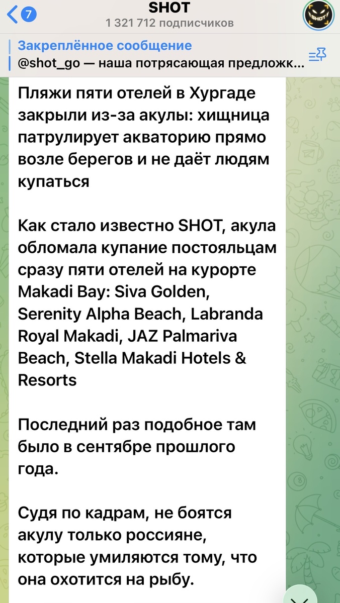 Акулы там живут, Уважаемый Читатель! И даже сейчас, в египетскую зиму, они не уходят в теплые воды. А дрейфуют у берегов. Где и когда? Будьте в курсе. Привет! С Вами Елена! Телеграм-канал SHOT знает все. Но, как это часто бывает, "раздувает из мухи слона". Мои туристы сейчас отдыхают в Макади Бей. Это Хургада, Уважаемый Читатель! Их отель не близко к месту происшествия, но рассказываю из "первых рук". Акулу, точнее, как говорят, это был небольшой акулёнок, видели на пляже отеля Siva Golden Bay Makadi 4*. Отель находится не в самой бухте, а немного дальше по береговой линии! В очень красивом месте, это залив, он называется Шарм-Эль-Араб. Мне его рекомендовал истинный любитель и почитатель Красного моря. Там зачетный коралловый риф! Не истоптанный, а цветущий-растущий! Коралловое плато здесь рядом с берегом. A это сама бухта Макади Бей: Акула подплыла к берегу, резвилась в воде, охотилась за мелкой рыбешкой. На глазах наших людей благополучно поймала "свою рыбную еду", покрутила хвостом