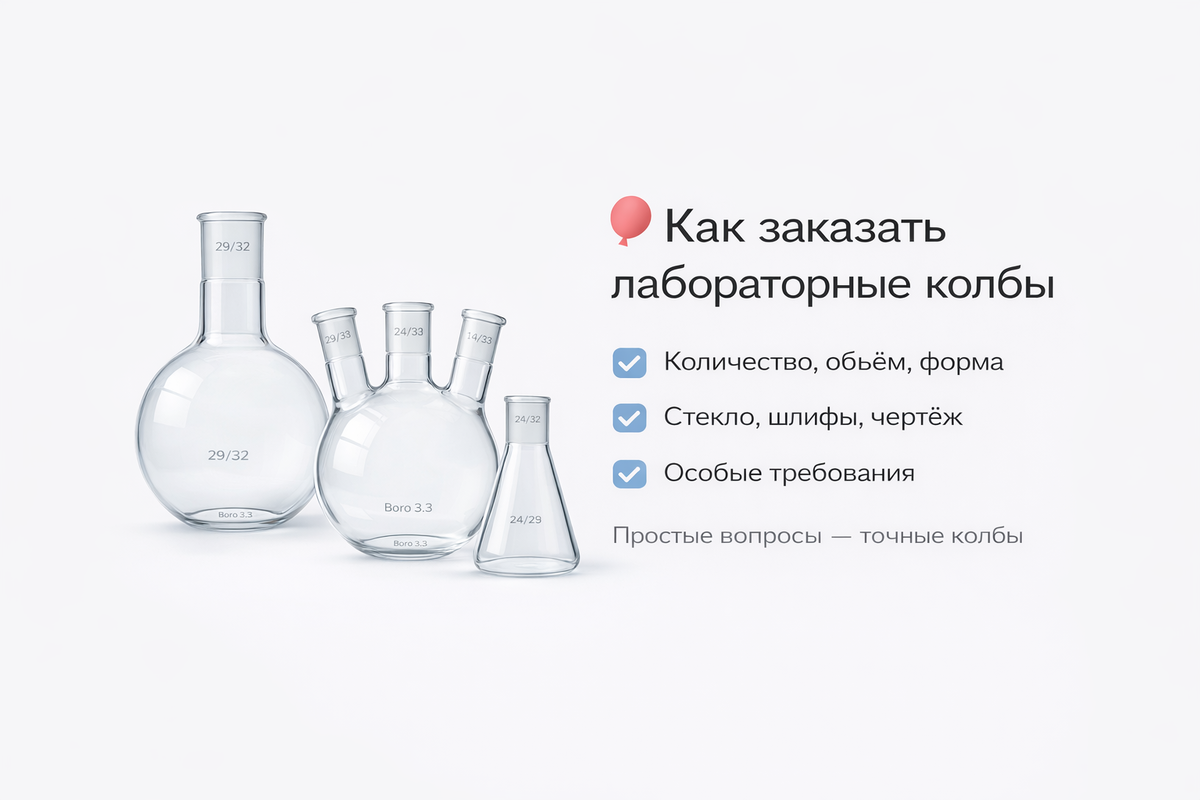 Чтобы всё получилось без доработок и потери времени, мы всегда начинаем с простого диалога. Что помогает нам сделать колбы идеально подходящими: ▫️ Количество Одна колба или серия — подскажем оптимальный вариант по срокам и стоимости. ▫️ Объём и форма Круглодонные, плоскодонные, многогорлые — подбираем под процесс, а не «как у всех». ▫️ Горловины и шлифы Точные размеры и сочетания (29/32, 24/29, 14/23 и др.) — для совместимости с вашим оборудованием. ▫️ Стекло Боросиликат Boro 3.3 — стандарт для работы с температурой, вакуумом и реактивами. ▫️ Толщина стенки Стандартная или усиленная — в зависимости от условий эксплуатации. ▫️ Особые требования Вакуум, давление, агрессивная среда, нестандартная геометрия — всё учитываем заранее. ▫️ Чертёж или описание Даже простое текстовое описание уже достаточно, чтобы начать расчёт. ✨Наша задача — задать правильные вопросы и взять ответственность за результат. В итоге вы получаете колбы, которые работают, а не просто выглядят правильно. Если нужен р