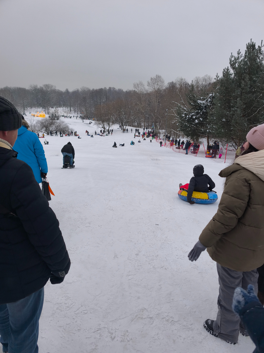 На новогодних праздниках все таки добрались до большой трассы на тюбингах - а именно в Кузьминках. Чтобы быстрее добраться - нужно заходить со стороны кинотеатра - проходим по аллее - идем по прямой - по прямой и вот большой склон. Мы катались до этого на деревянных горках, хороших, но не таких больших, не так далеко рядом с домом. Если рядом еще не было раскидано химикатов - едешь быстро и далеко и большего и не надо. Но все равно очень уж хотелось попробовать что то более масштабное. Так как мы не в шаговой доступности - взяли с собой хорошие ледянки, хотя рядом есть прокат, но очередь километровые и не факт что ватрушка вам на самом деле и достанется, даже при большом желании. Итак, ребенок скатился всего один раз и больше не захотел, а я глядя на все это тоже решила что с нас хватит. В итоге прокатились всего один раз. Спрашиваете почему? Горка абсолютно стихийно-неконтролируемая. Да, есть отдельно огороженный склон для подъема, но в остальном ни что никак не контролируется. Вот е
