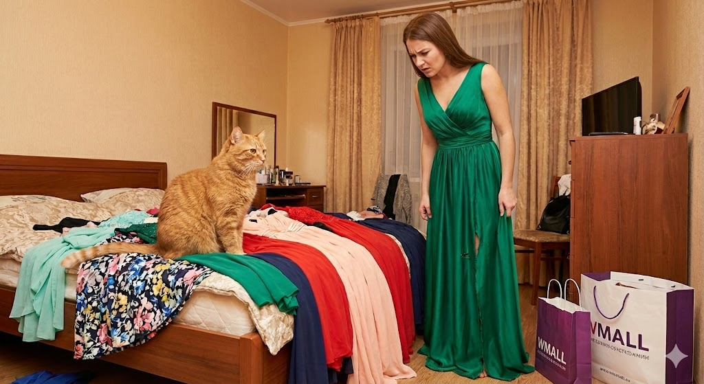 Пришлось идти на крайние меры. Раз она была в зеленом, я решил: если я его слегка «помечу» когтями, она просто не сможет его сдать обратно, и выбор будет сделан автоматически. Я прицелился в бирку, которая болталась на талии, прыгнул, зацепился... и промахнулся. Вместо пластиковой нитки мой коготь вошел прямо в нежную ткань юбки. Раздался характерный звук рвущейся материи. Аня взвизгнула и замахнулась на меня.