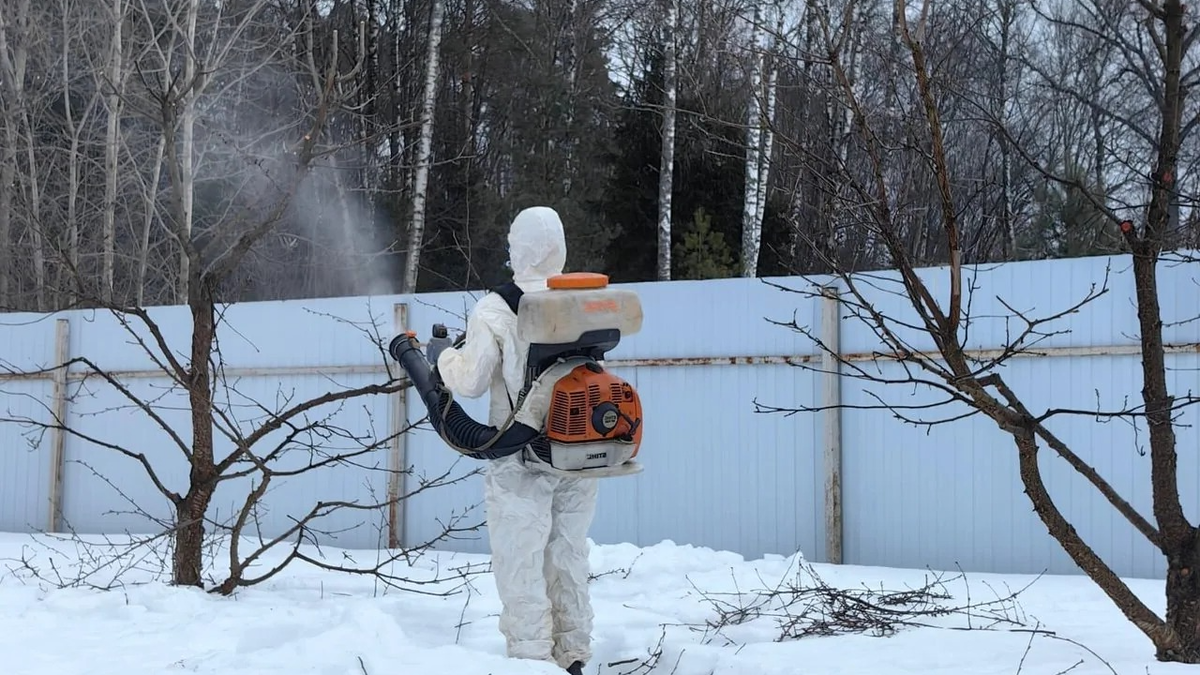 Он равномерно распределяет раствор. Никаких проплешин, никаких сухих зон. Всё, что нанесено, при таянии аккуратно уходит вниз, туда, где и находятся зимующие вредители.