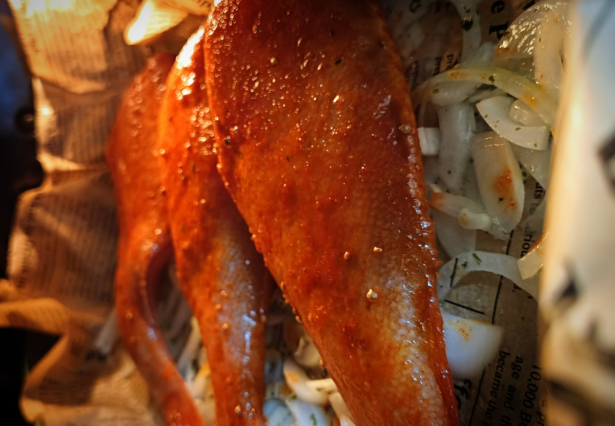 2. Теперь каждую тушку сбрызгиваем лимонным соком. Подсолим и посыпаем специями. Я обычно использую копчёную паприку и кориандр. Поливаем оливковым маслом.