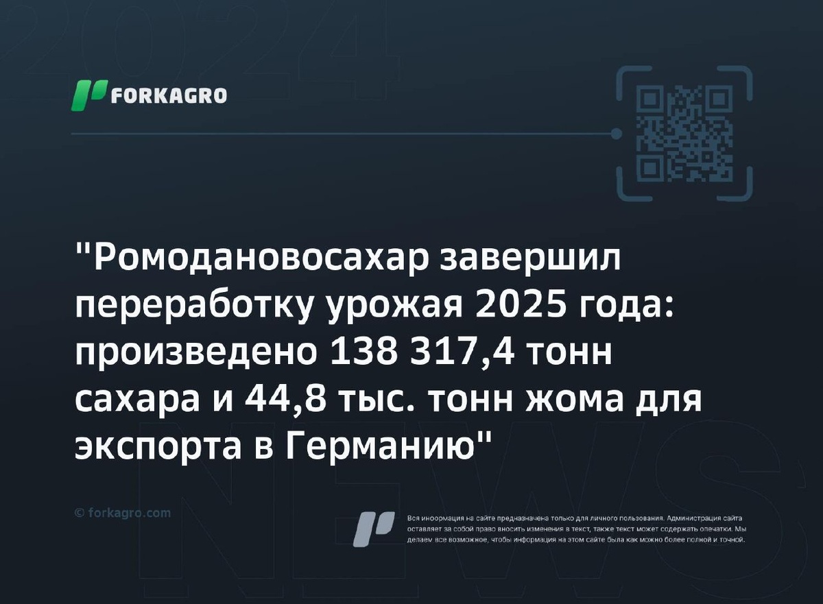 тонн жома для экспорта в Германию" Минсельхоз Республики Мордовия сообщил о завершении сезона переработки сахарной свёклы компанией "Ромодановосахар" в урожае 2025 года. Предприятие переработало 885 768 тонн сырья, произведя 138 317,4 тонн сахара. Средняя заработная плата сотрудников составляет 84 902 рубля. Продукция экспортируется в Германию и другие регионы, общий объем экспорта составил 44,8 тыс. тонн гранулированного жома на сумму 427,8 млн рублей. Перейти к источнику