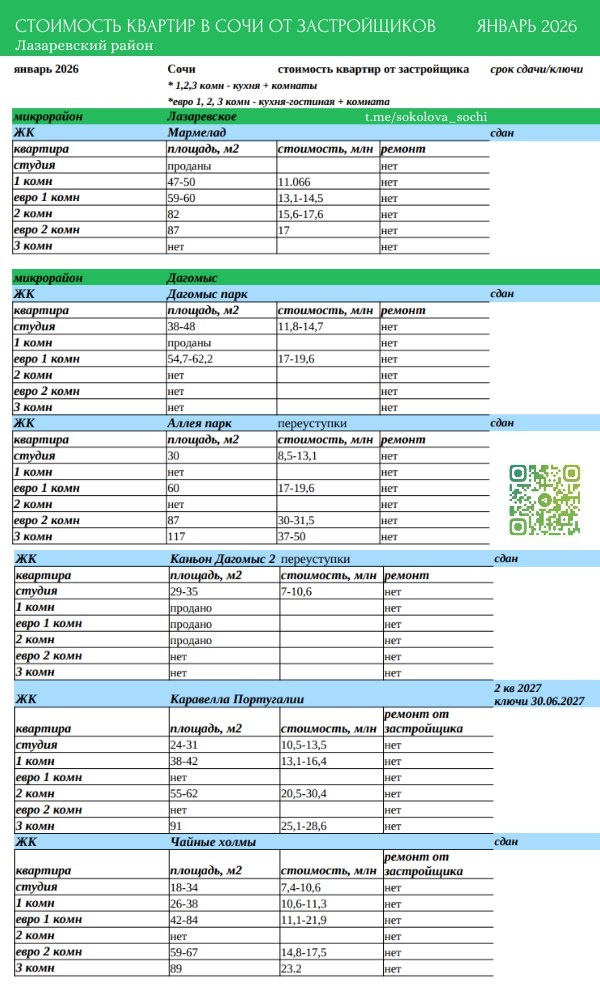 Январь 2026 | Лазаревский район ✔ЖК Мармелад ✔ЖК Каравелла Португалии ✔ЖК Чайные холмы ✔ЖК Дагомыс парк ✔ЖК Аллея парк ✔ЖК Каньон Дагомыс 2 Полезная информация? Ставь ❤️ и продолжим Запись на консультацию 8-900-280-18-75 или здесь #сочиполюбви