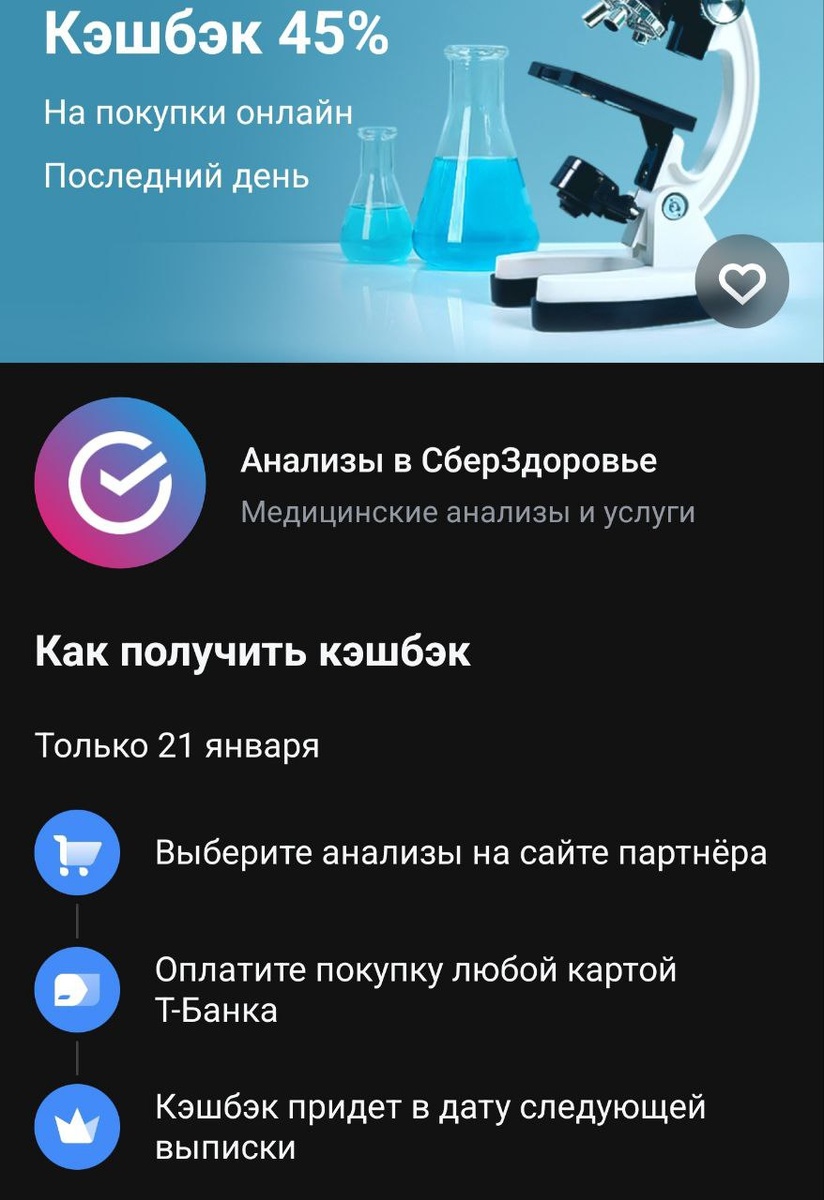 👉 Кешбек 45% на анализы (в рамках вашего месячного лимита кешбека) (ищите в разделе кешбек дня) 👉Качаем сберздоровье - активируем нужный промокод на скидку (если есть), после выходим - закрываем приложение, идем в т, там переходим по ссылке и там оплачиваем, там прям напишет сумму кеша от Т. Но там пром не активировать, сделайте заранее при наличии. Если прома нет - достаточно набросать корзину - выйти - подождать пару часов и пришлют смс с промо. + придет кеш сберспасибо (около 15% обычно) ➡️Получить карту Т-Банка ➡️Подписаться на Дискаон