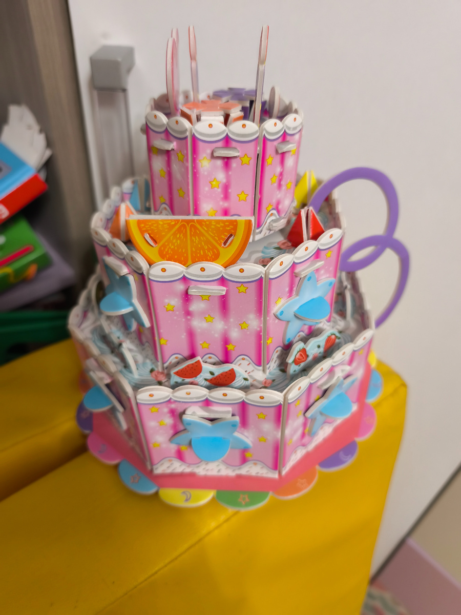 Вот такую поделку дочь делала на новогодних каникулах. Покупали в фикс прайсе, привлек дизайн и конечно приставка "музыкальная". Собирается тортик быстро и довольно просто, возможно надо будет немного помочь сначала с инструкцией и понять, как вообще что делается и вставляется. За час тортик был сделан. Получилась красивая конструкция, крепкая, не разваливается даже без клея. Но вот мелодия хиленькая и очень тихая. Так что только ради нее брать поделку не стоит. А так хороший, недорогой вариант для творчества и досуга один вечер.