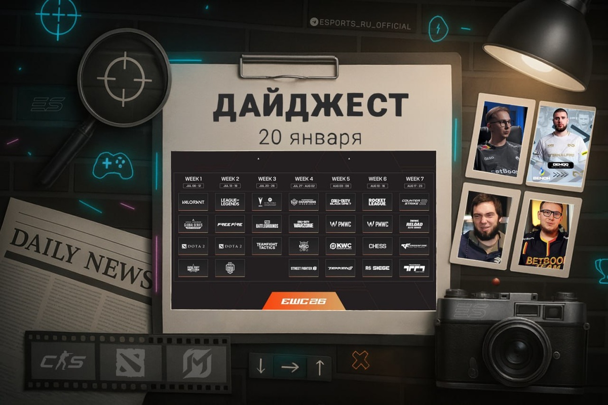➖ Korb3n временно займет пост тренера Team Spirit. ➖ Появились даты всех турниров, которые пройдут в рамках Esports World Cup 2026. ➖ Gpk рассказал, как улучшить игру на своей роли. ➖ RAMZES666 составил список лучших оффлейнеров в 7.40b. ➖ Panto назвал лучших героев для четвертой и пятой позиции и дал советы по сборке. ➖ Eternal Fire ведут переговоры с DemQQ. ➖Самые актуальные скидки на 20 января в Steam. 👍 Esports.ru | Дайджест