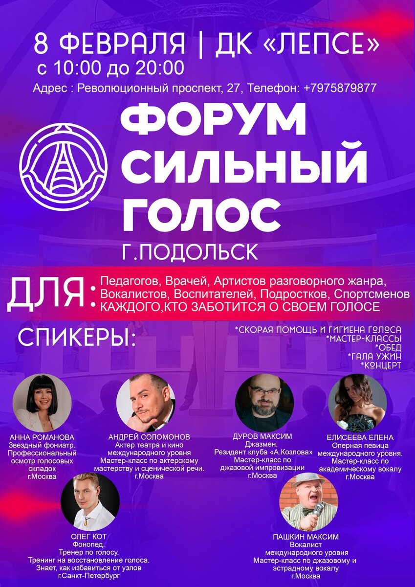 ! Я организовываю очень полезный и интересный форум в нашем городе. Раньше такого никогда не было. Прошу прочитать до конца: 🔥 Вас интересует развитие голоса и улучшение качества вашей профессиональной деятельности? ✨ Мечтаете повысить эффективность своей подачи в педагогике, выступлении или творчестве? 🎤 Жаждете стать уверенным спикером, артистом, преподавателем или тренером номер один? Мы рады пригласить вас на уникальный Форум "Сильный Голос" — мероприятие специально разработанное для педагогов, врачей, артистов разговорного жанра, вокалистов, воспитателей, подростков и спортсменов. ❇ Этот форум предназначен для каждого, кто ценит и заботиться о своём голосе! 📍 Здесь вы сможете познакомиться с лучшими мастерами сцены и ведущими специалистами в области здоровья голоса: ⭐Андрей Соломонов — международный актёр театра и кино, откроет перед вами тайну выразительной актерской игры и умения интонирования смыслом. 🎶Елисеева Елена — оперная певица с международным опытом, покажет