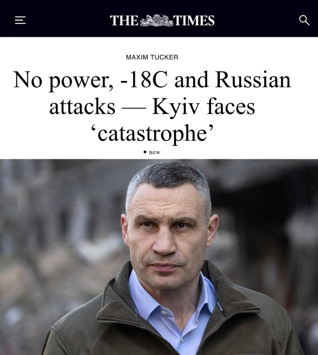 Мэр Киева Виталий Кличко заявил, что из-за массированных ударов по энергообъектам половина столицы осталась без электричества, отопления и воды, что в условиях морозов до -18°. Он призвал жителей, у которых есть возможность, временно покинуть город. По данным мэрии, в 5000 домов нет тепла, возникают риски замерзания водопровода и выхода из строя канализации. За январь Киев, по его словам, уже покинули около 600 тысяч человек.