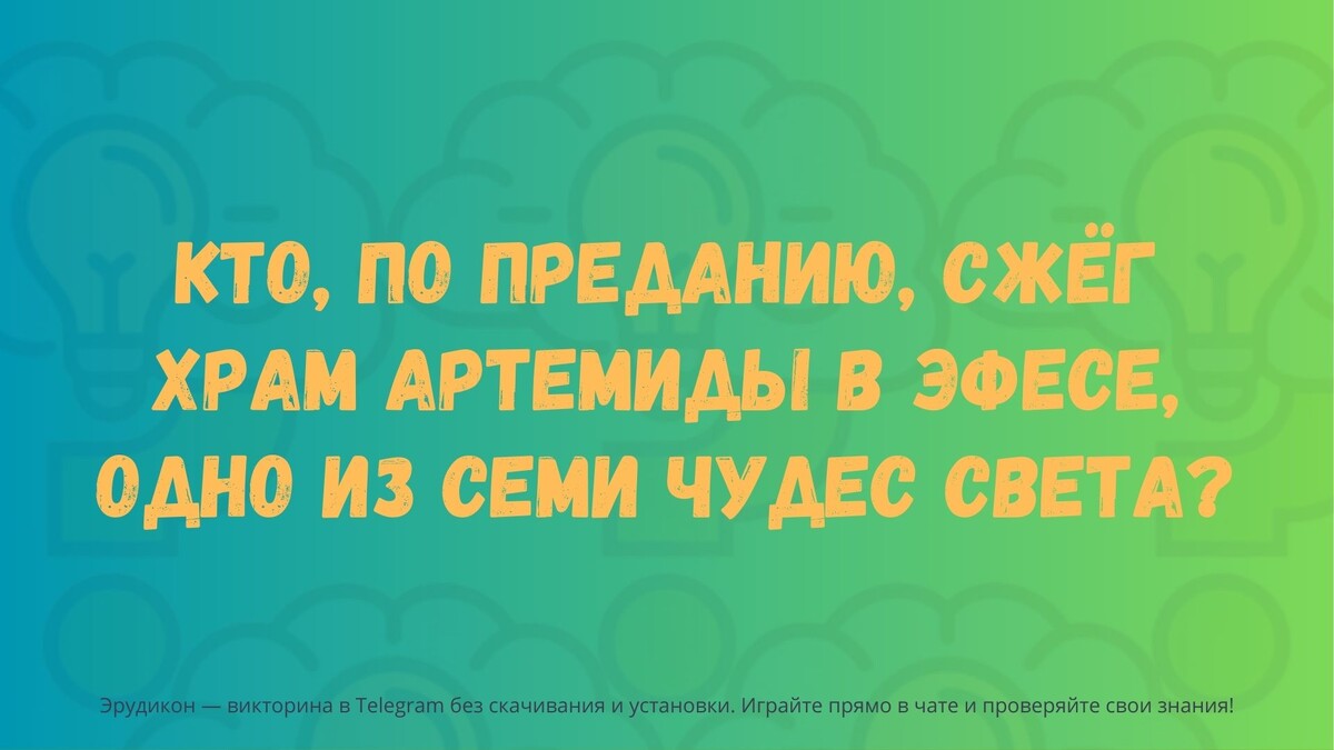 Викторина «Эрудикон» — вопрос №1600: Кто, по преданию, сжёг храм Артемиды в Эфесе, одно из семи чудес света?