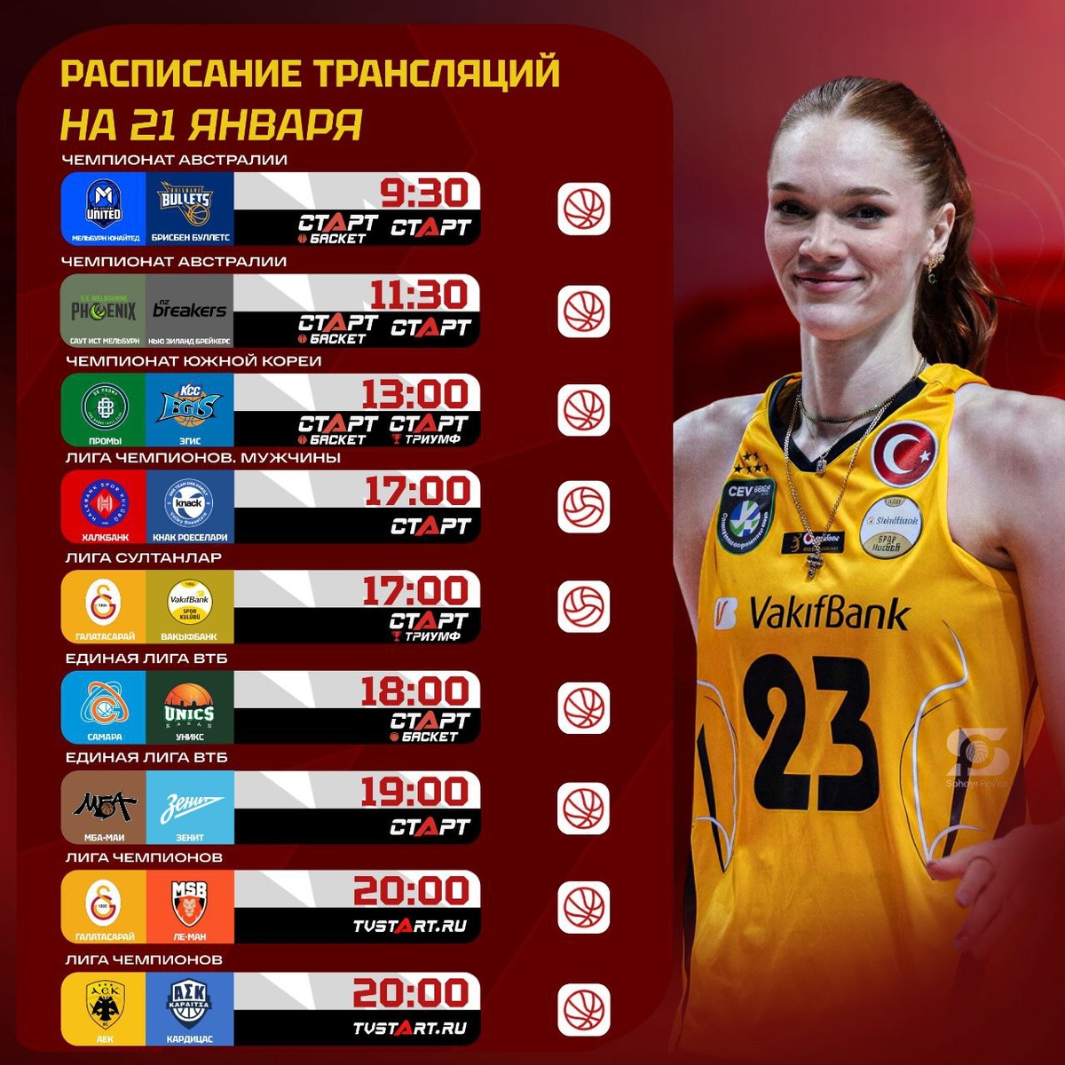 ! Выделяем матчи УНИКСа, «Зенита» и ЦСКА в Единой Лиге ВТБ для ценителей баскетбола. Волейбольных болельщиков сегодня ждут «Вакыфбанк» Марины Марковой и «Спортинг» Сергея Гранкина. Не останемся и без футбола, АЗ проведет первый матч после смены тренера против «Эксельсиора». Проведите этот день вместе с нами на телеканалах «Старт» и платформе TVSTART.RU 🖥 Подписывайся на ТВ СТАРТ в MAX📲