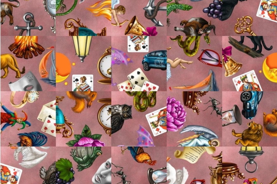 - Карты выкладывают в 5 рядов по 4 карты и вращают вокруг оси (не перемещая), чтобы совпали целые образы.