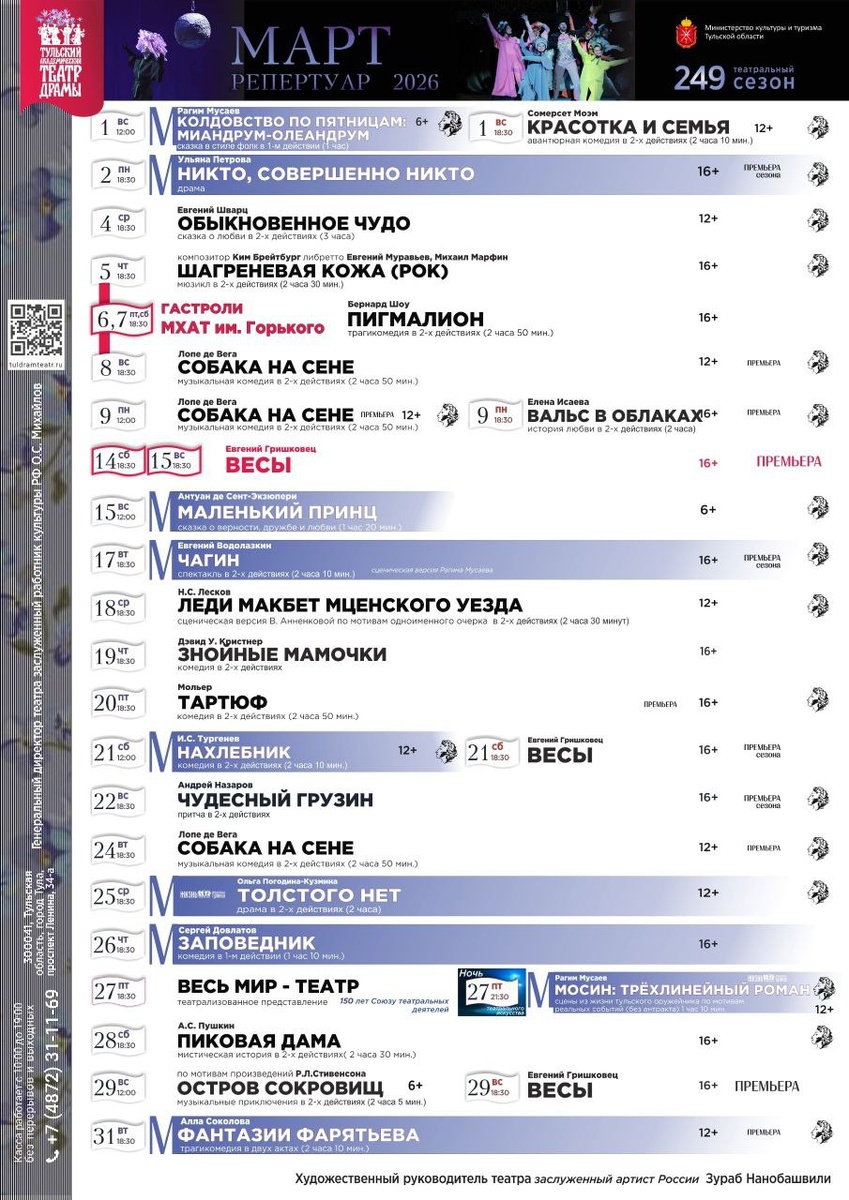 ! 🌞 Информация для театралов. Тульский драмтеатр уже открыл предварительную продажу билетов на спектакли ✨МАРТА✨ 🔔 Что будет самым интересным? 📍6 и 7 марта ГАСТРОЛИ Московского Художественного академического театра им. М. Горького (трагикомедия Бернарда Шоу "ПИГМАЛИОН") 📍14 и 15 марта ПРЕМЬЕРА спектакля "ВЕСЫ" Евгения Гришковца в постановке Анны Терёшиной ✅ Театральная касса работает с 10:00 до 19:00 без перерывов и выходных. ✅ Электронные билеты на спектакли можно купить на сайте театра в разделе Афиша-Март 👉 clck.ru/3RMvQJ
