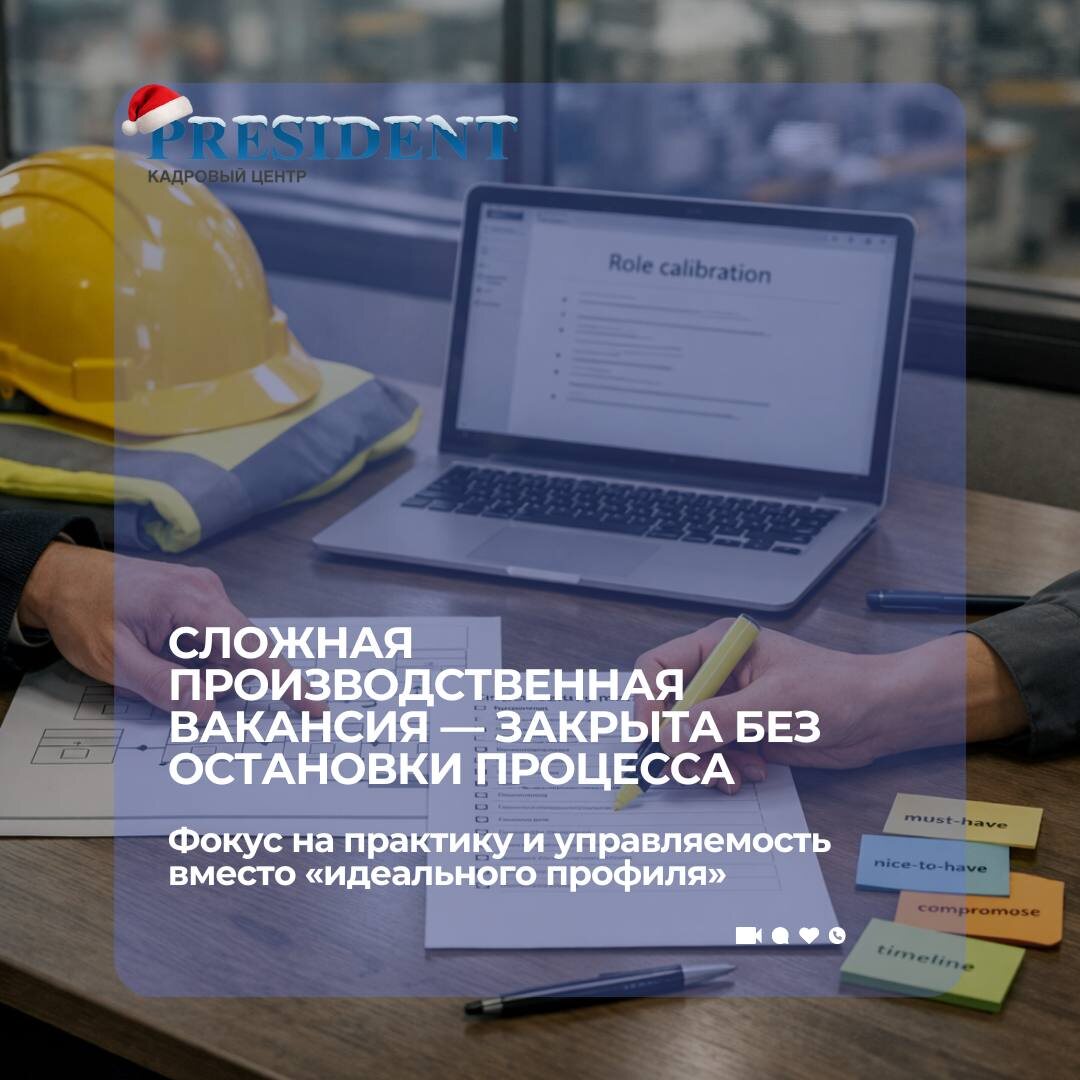 Вакансия пришла с чётким запросом: ключевая роль на производстве, от которой напрямую зависели сроки и стабильность выпуска. 📍Позиция требовала не просто профильного опыта, а понимания реальных условий: оборудования, сменности, взаимодействия с цехом и ответственности за результат. Что усложняло подбор: 1️⃣узкий рынок кандидатов 2️⃣высокая цена ошибки 3️⃣ограниченные сроки из-за производственного плана 4️⃣необходимость быстрого вхождения без долгой адаптации Мы начали с детальной калибровки запроса: уточнили реальные задачи, критичные навыки и зоны, где возможен компромисс. Фокус сместили с «идеального резюме» на практический опыт и управляемость кандидата в производственной среде. Результат: ☑️вакансия закрыта без срыва сроков ☑️кандидат вышел в плановом режиме ☑️производственный процесс не останавливался Этот кейс — пример того, что в производственном подборе решает не количество кандидатов, а точность оценки и понимание задачи бизнеса. ➡️В следующих постах продолжим разби