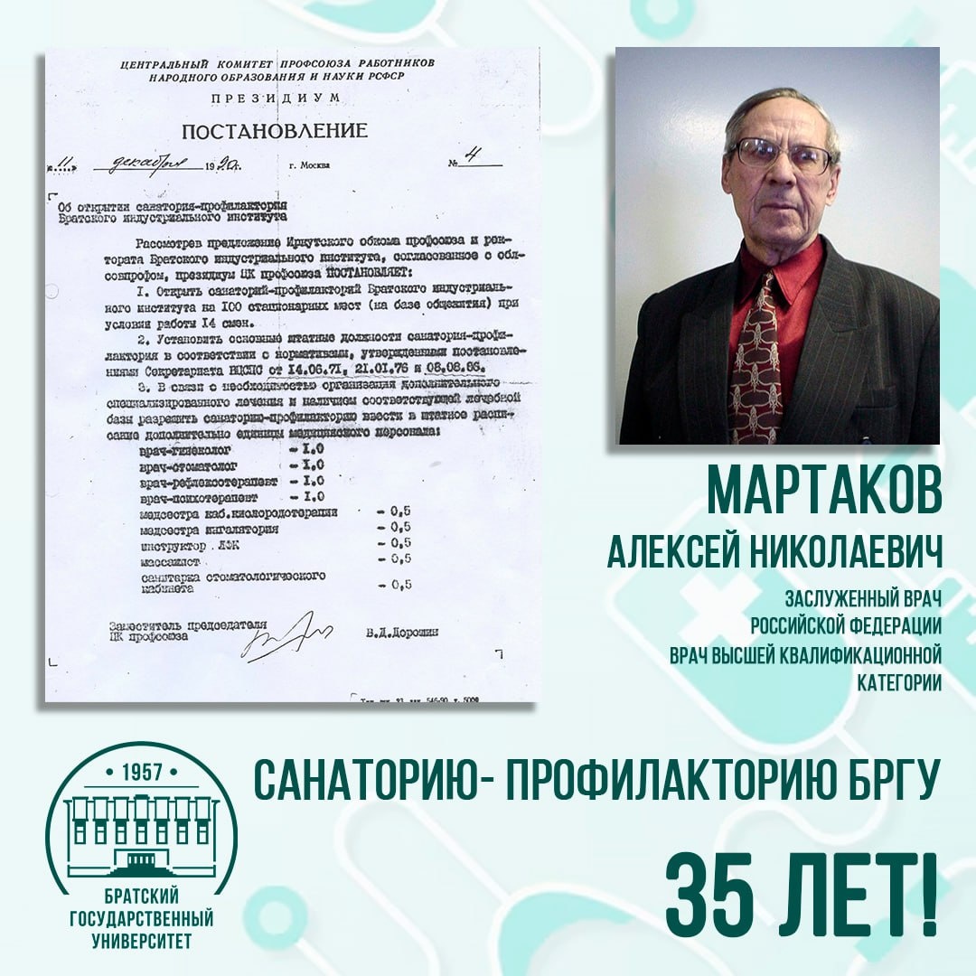 💬 В 1989 году в Братском индустриальном институте было принято важное решение - создать санаторий-профилакторий для сохранения здоровья студенческой молодёжи! Главным врачом стал Алексей Николаевич Мартаков - заслуженный врач РФ, врач высшей категории и талантливый организатор. Благодаря его энергии и энтузиазму уже в декабре 1990 года было утверждено открытие санатория на 100 стационарных и 10 амбулаторных мест. За короткое время была создана современная лечебная база, открыты специализированные кабинеты - гинекологический, стоматологический, рефлексо- и психотерапии. 📅 21 января 1991 года санаторий-профилакторий впервые принял студентов и сотрудников вуза. Несмотря на сложные годы экономического кризиса, Алексею Николаевичу удалось сохранить учреждение и весь спектр медицинской помощи. 17 лет он оставался бессменным руководителем вузовской здравницы, заложив прочный фундамент её развития. Забота о здоровье в БрГУ - это традиция, проверенная временем 💙 👻 MAX | 📲 ВК | 📝 ДЗ