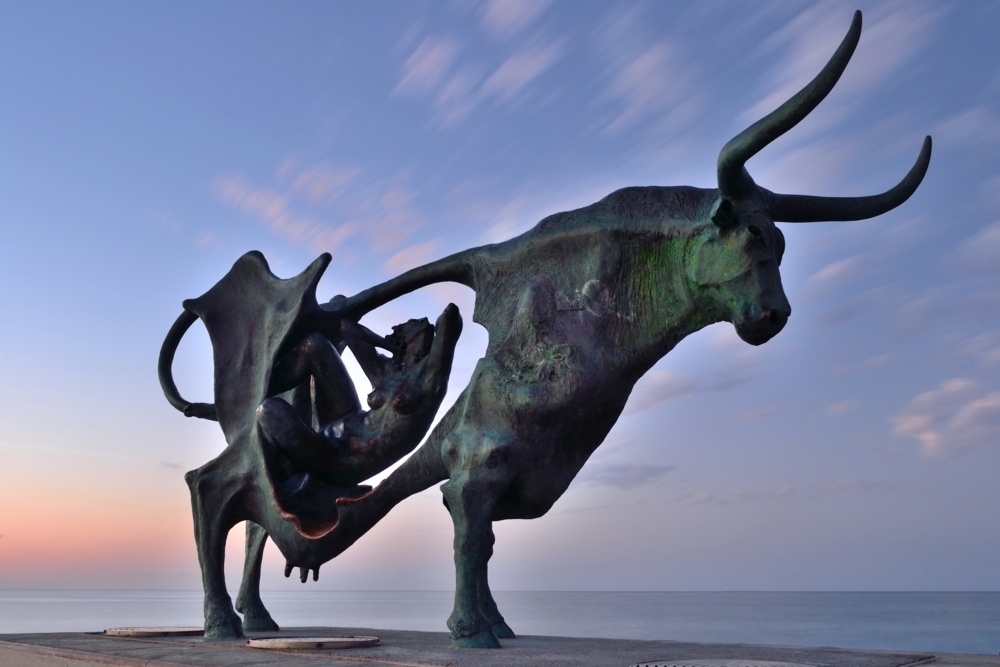 Если вы окажетесь на пляже Рибес-Рожес в каталонском городке Виланова-и-ла-Жельтру, ваше внимание неизбежно прикует гигантский бронзовый зверь. Это не просто статуя быка. Это одна из самых смелых и мистических скульптур Средиземноморья — «Пасифая» работы мастера Оскара Эструга.