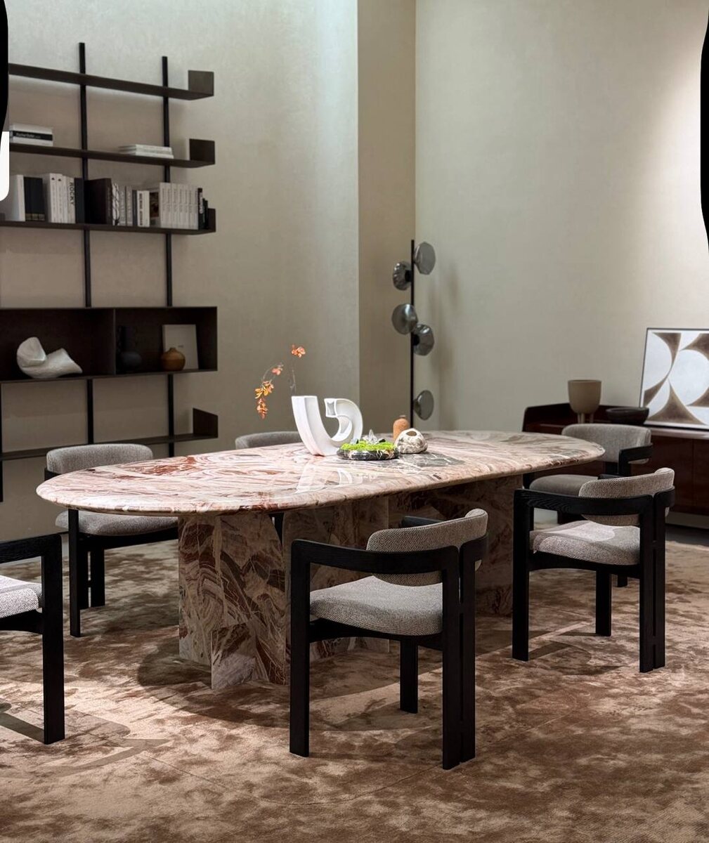 Он выглядит как коллекционный арт-объект, который мгновенно превращает обычную столовую в пространство уровня люкс. 🏛 Мебель как шедевр: Стол из натурального камня с уникальным рисунком Природа — лучший дизайнер, и этот стол тому подтверждение. Каждый сантиметр его поверхности — это неповторимая картина, созданная самой землей на протяжении тысяч лет. ✨ Почему этот стол станет центром вашего дома: • Архитектурное основание: Скульптурные ножки в форме арок придают столу монументальность и в то же время легкость. Это баланс между брутальностью камня и мягкостью линий. • Идеальная форма: Овальная столешница — самое гармоничное решение для интерьера. Она способствует долгому общению и идеально подходит для уютных ужинов или статусных переговоров. • Тактильный восторг: Идеально отполированная поверхность дарит прохладу и ощущение надежности. Отправьте Ваш проект, мы сделаем расчет @Mak_sim111