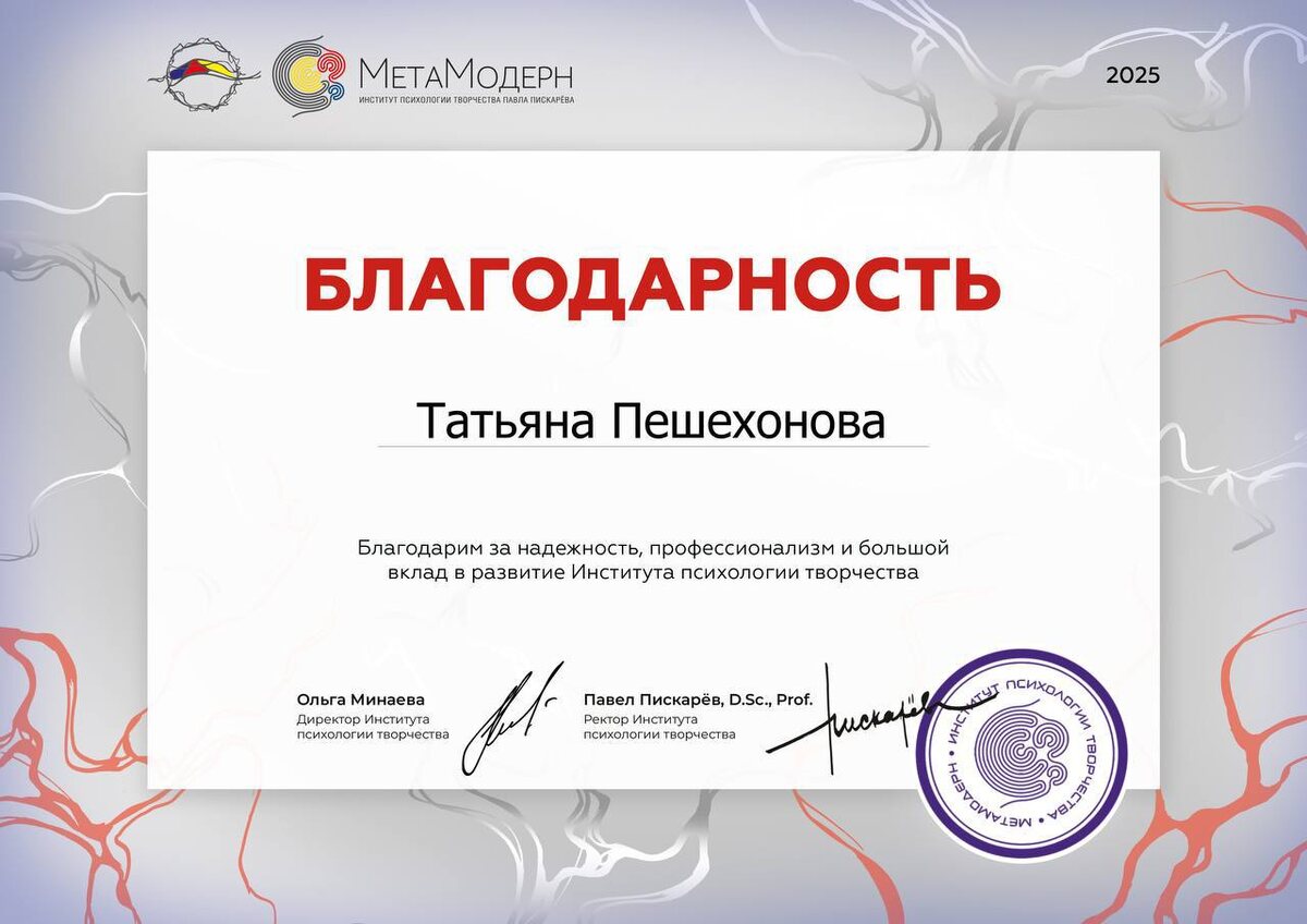 Хочу отметить, что я продолжаю свою работу в Институте психологии творчества Пискарева