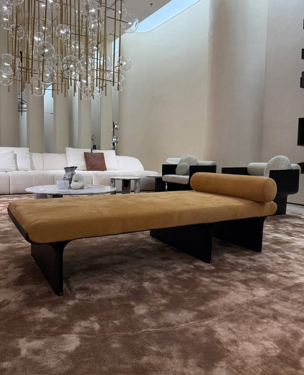 ) 🌑 Must-have для ценителей дизайна: Ochre Daybed Чистые линии, архитектурная форма и невероятная фактура. Предмет мебели, который заявляет о вашем статусе и любви к прекрасному. • Силуэт: Современный минимализм. • База: Темное дерево, арочная конструкция. • Текстура: Бархатистая матовая поверхность (супер-тактильно!). • Деталь: Стильный цилиндрический подголовник. Отправьте Ваш проект, мы сделаем расчет @Mak_sim111