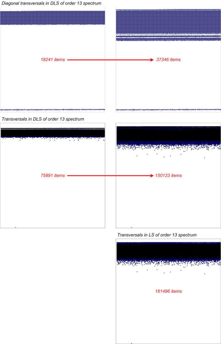 Завершен вычислительный эксперимент, связанный с построением спектров трансверсалей в ЛК/ДЛК порядка 13. Напомню, как все было... Подготовительный этап данного эксперимента был выполнен еще в 2022 г. и заключался, следуя уже неоднократно обкатанной стратегии, в формировании опорных спектров от различных специальных типов ДЛК с их последующим расширением путем вращения интеркалятов и циклов. Спектры трансверсалей общего вида и диагональных трансверсалей при этом строились совместно, что показывает неплохие результаты по сравнению с их построением по отдельности. Далее в первой половине 2023 г. спектр числа диагональных трансверсалей был расширен путем полной распределенной диагонализации образующих его квадратов, на что потребовалось около полугода расчетов в проекте RakeSearch. Далее с использованием указанных выше преобразований полученные спектры перестали меняться и мы перешли к обработке следующей по порядку размерности N=14. Параллельно с этим и чуть позже по времени при построени