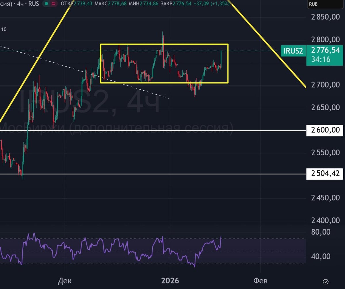 Рынок остается новостным, на нем отыгрывается прилет американской делегации в Москву. Мирный план все на том же уровне согласования, что был ранее. Но любое упоминание мирного плана в новостях - отыгрывается позитивно нашим рынком. 🚗 Я все еще супербык по рынку, мои цели гораздо выше, но при текущей ситуации, индекс все еще настаивается в боковике. Выход вверх из боковика откроет дорогу к сопротивлению 2820, которое мы не смогли пробить в прошлый раз. #индекс #индексмосбиржи #ммвб #irus #mxi #mix #imoexf #bogdanoffinvest $IMOEXF $MXH6 $MMH6