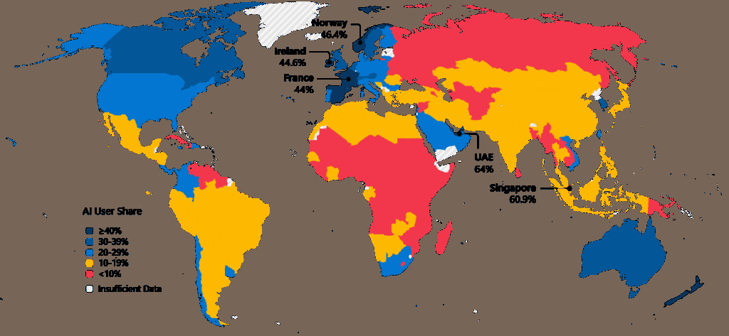 Прежде чем судить Россию, полезно посмотреть на глобальный контекст. По данным Microsoft, в 2025 году ИИ-сервисы использовало 16,3% населения планеты — примерно каждый шестой человек. Это рост с 15,1% за полгода ранее, что выглядит скромно для технологии, захватившей мировой интернет.