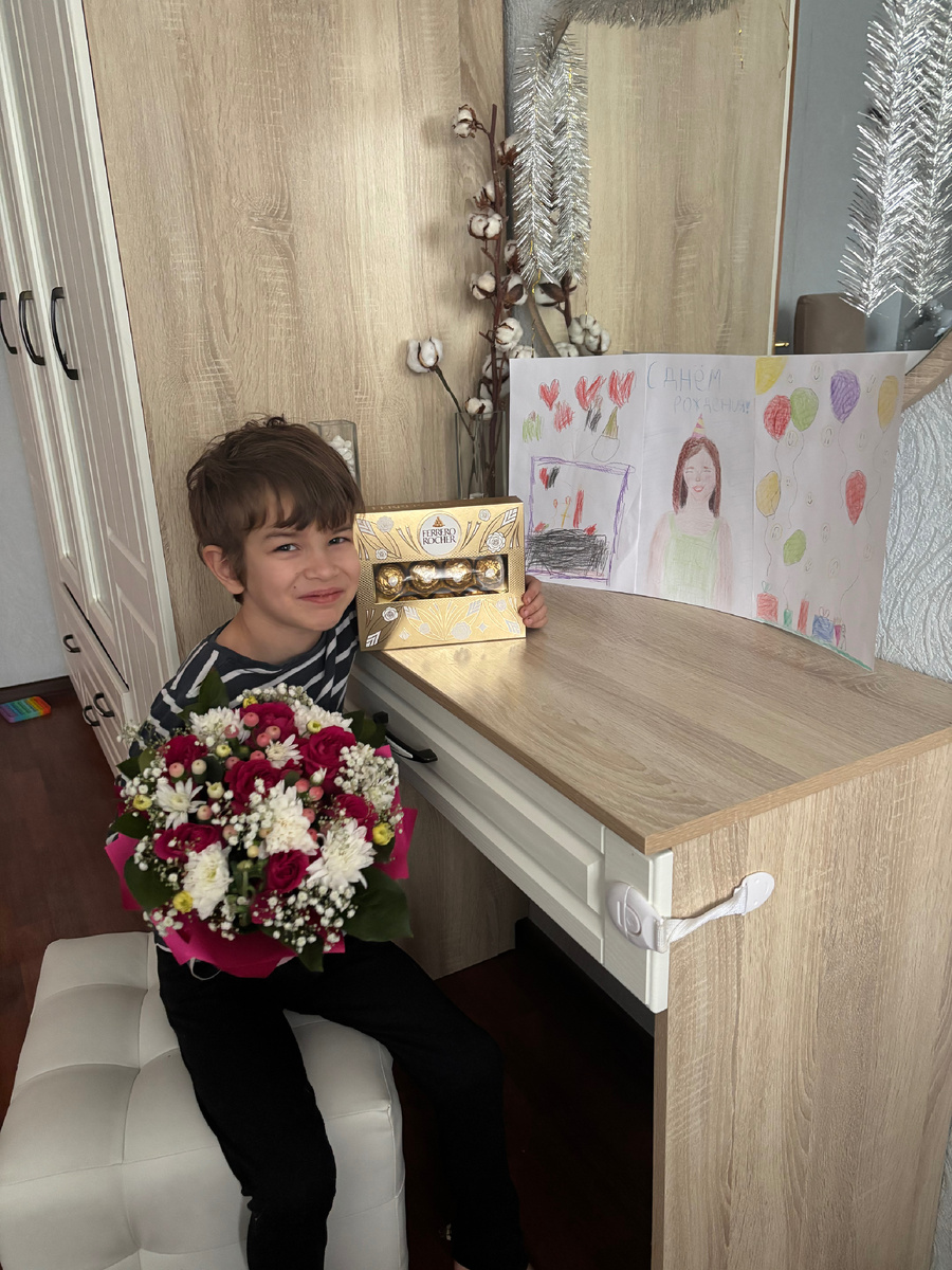 Сегодня в 7 утра я проснулась с ощущением полного счастья. Дети прибежали обниматься и целовать меня, подарили плакат 😊. Любимый муж с самого утра принёс букет, ferrero rocher и подарок из Tom Tailor. А мама с детьми приготовили восхитительный шоколадный торт.