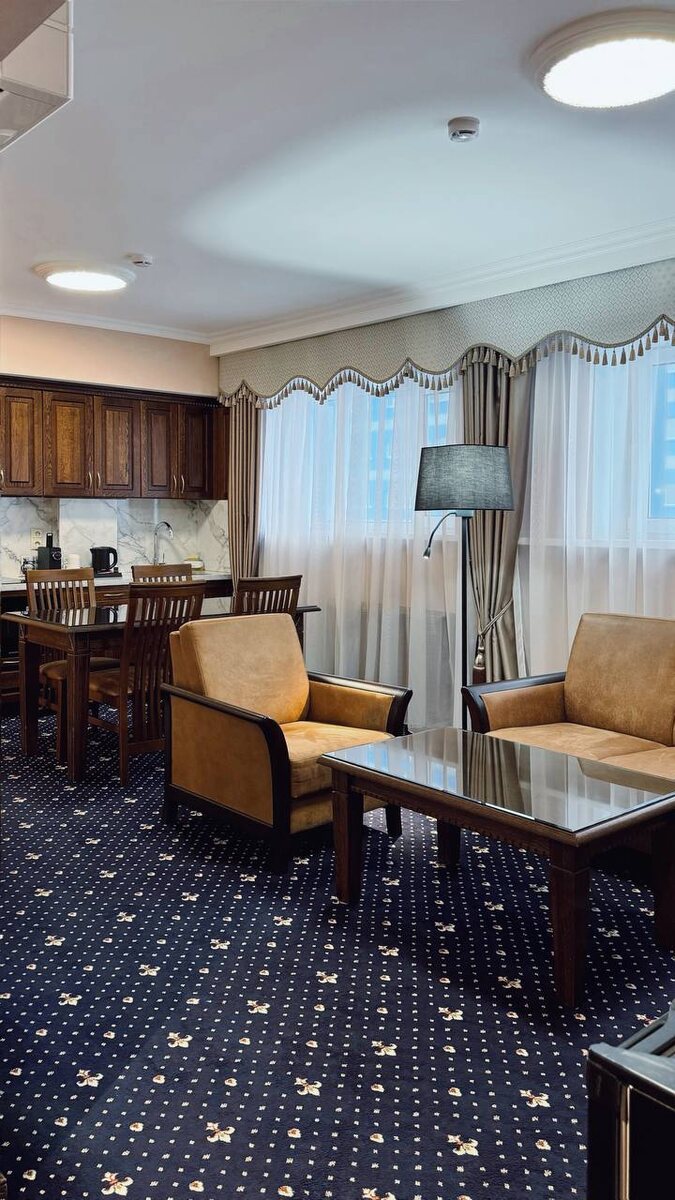 »? ⭐️⭐️⭐️⭐️ Первое впечатление – простор и свет. Сквозь легкие шторы солнце мягко наполняет комнату, а продуманное освещение поддерживает ощущение тепла в любое время дня. Ковровое покрытие с изящным рисунком и строгая деревянная мебель подчёркивают продуманность оформления. Палитра выдержана в спокойных тонах: тёплый коричневый, светлый беж, акценты белого. В ванной царит порядок и чистота. Плитка с интересным природным рисунком, большое зеркало и современная фурнитура создают элегантный вид. Просторная ванна с матовой перегородкой, свежие полотенца и базовые мелочи – всё, чтобы уединиться и подготовиться к новому дню. В «Гранд Классик» каждый может отдохнуть от повседневной суеты, расслабиться и почувствовать себя желанным гостем ✨