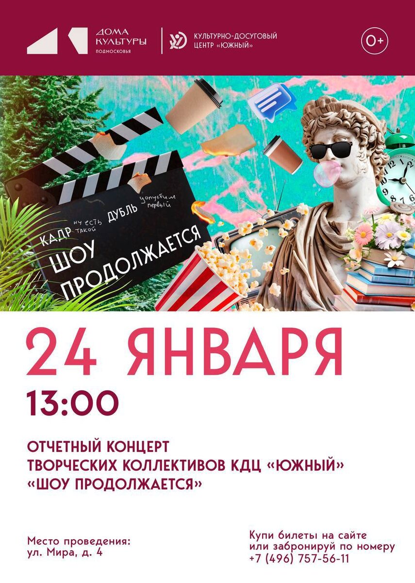 ✨ «ШОУ ПРОДОЛЖАЕТСЯ»- концерт-ревю творческих коллективов КДЦ «Южный». Телевизионное шоу с очень низким рейтингом под угрозой закрытия. Как быть? Можно ли спасти такой провальный проект? Где черпать вдохновение? Как будет выкручиваться режиссёрская команда телешоу, увидим в концертной программе творческих коллективов КДЦ «Южный». 🚫 Возраст: 0+ 📆 24.01.2026 🕒 13:00 🏢 ДК ЗИО 📍 г. Подольск, ул. Мира, 4 💰 Цена: 400 ₽ 🔗 Купить билет: https://showgoon.ticketscloud.org/ ⭐Поддержать канал голосом 🍰Где поесть в Подольске #концертПодольск #детямПодольск #спектакльПодольск ✅ Мероприятия Подольск https://dzen.ru/id/66ed500f7b5671493eca3fd6 http://vk.com/podolsk_events http://dzen.ru/podolsk_events
