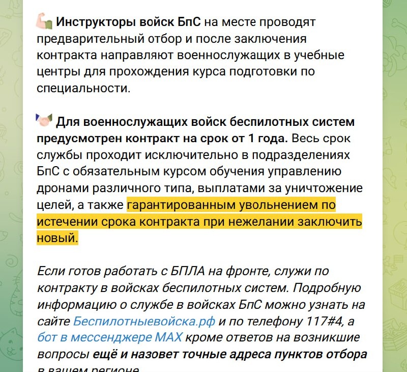 ограниченный по времени контракт - от 1 до 5 лет - с гарантированным увольнением по его окончанию. Напомним, что сейчас большинство военнослужащих по контракту и мобилизованные служат фактически бессрочно, так как их контракты автоматически продлеваются до окончания периода частичной мобилизации, с связи с указом президента от 21.09.2022 N 647 «Об объявлении частичной мобилизации в Российской Федерации». Однако, из этого правила существуют различные исключения. Вполне вероятно, что для увеличения привлекательности службы в войсках беспилотных систем России, исключением станет и подписание контракта на службу во входящих в их состав подразделениях. Если, конечно, все будет работать так как сказано. Военный Осведомитель