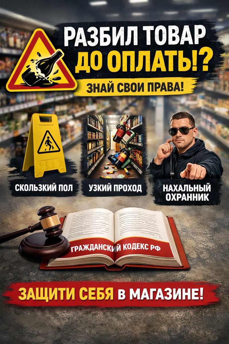 Сохраните себе или распечатайте — эта информация может однажды спасти ваши нервы и деньги. Многие покупатели не знают, но разбитый в магазине товар — не всегда обязанность покупателя оплачивать его. Всё зависит от обстоятельств. Ваш главный союзник — статья 1064 Гражданского кодекса РФ. Ключевая формулировка: Лицо, причинившее вред, освобождается от возмещения, если докажет отсутствие своей вины. Что это означает на практике: Товары должны быть устойчиво и безопасно размещены. Это обязанность магазина. Существуют нормы, которые магазины обязаны соблюдать. Согласно ГОСТ 51773-2001 и СНиП 2.08.02-89, минимальная ширина проходов: Если в проходе стоит «пирамида» из бутылок, коробок или акционных стоек, и из-за этого: ответственность снова лежит на магазине. Охранник не имеет права: В таких случаях стоит помнить о статье 203 УК РФ — превышение полномочий сотрудником ЧОП. За подобные действия предусмотрена уголовная ответственность. Корректный диалог выглядит примерно так: — Вы что-то разби