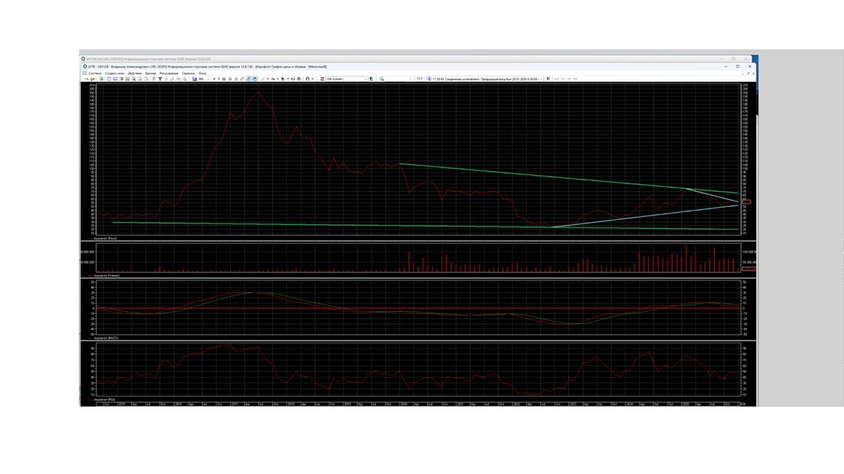 Новостной фон улучшается, «Аэрофлоту» начинают разрешать летать по многим странам, рубль устойчив, находится на уровне 80. Нефть находится на уровне 60-65. Центральный банк РФ понизил ставку до уровня 14-15%, компания «Аэрофлот» сообщает инвесторам, акционерам об улучшении своего экономического положения. Также планирует рассмотреть на Совете директоров вопрос о повышение размера дивидендов за 2025 год. До конца января акция продолжает находиться на линии сопротивления понижающегося коридора. К середине февраля быки постараются приблизиться к уровню 58-59, к концу февраля закрепиться на уровне 58-59. В середине марта быки, чувствуя свою силу и поддержку от компании, закрепляются выше уровня 60, и берут направление к уровню 65.