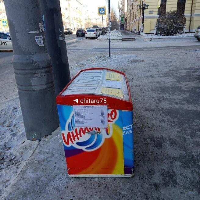 У магазина «Арбат» на улицу вынесли холодильник с мороженым, а на крышку наклеили ценники — вдруг кто-то в -40 решит охладиться. В самом магазине такое решение не прокомментировали. Остается только гадать, что это — маркетинговый ход или экономия электричества. Фото от очевидца 🟦 «Чита.Ру» в MAX