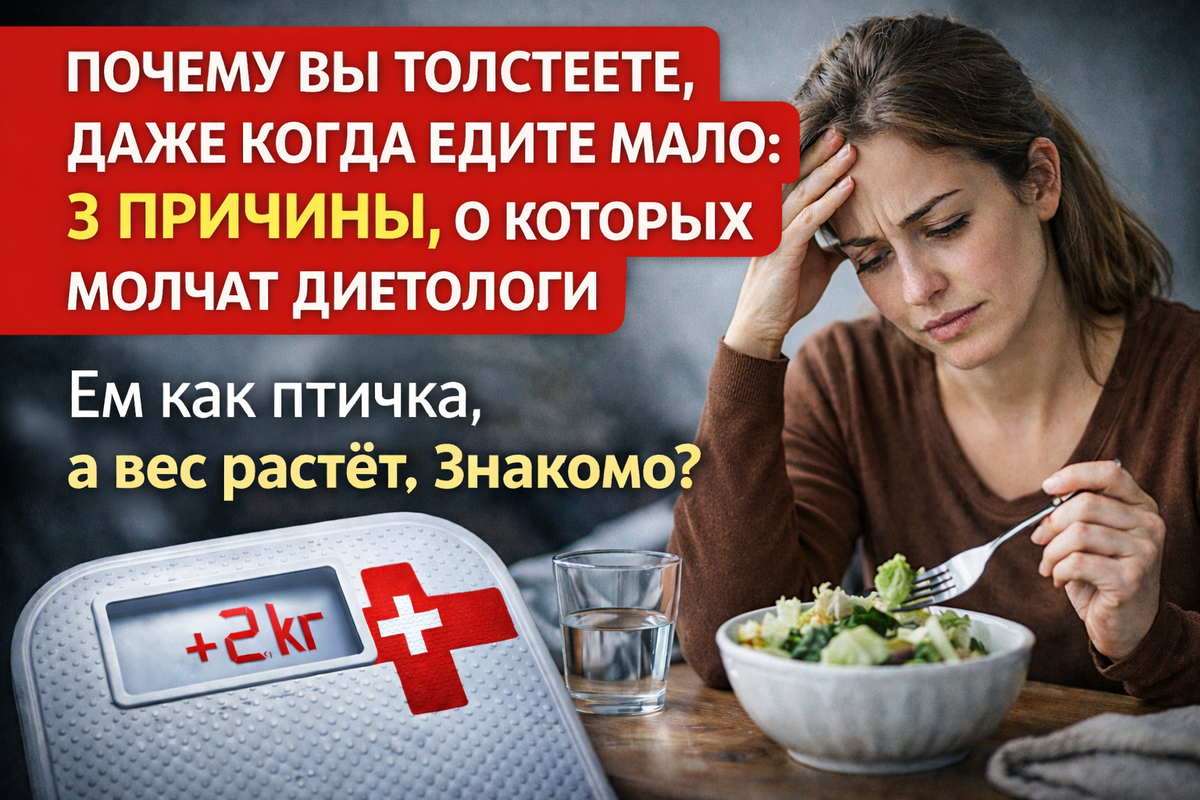 Ем как птичка, а вес растёт. Знакомо? Вы уже месяц на дефиците калорий. Отказались от сладкого, едите салаты, пьёте воду. А весы показывают +2 кг. И все вокруг говорят: "Значит, ешь больше, чем думаешь". Но вот что интересно: проблема часто совсем не в количестве еды. Давайте разберём три реальные причины, почему организм набирает вес даже на минимальных калориях. И почему это не про вашу силу воли. Когда вы едите мало, тело воспринимает это как угрозу. Как голод. И начинает экономить каждую калорию. Метаболизм замедляется. Щитовидка снижает выработку гормонов. Тело переходит в режим "сохранить всё, что можно". Результат? Вы едите 1200 калорий, а организм тратит 1000. Остальные 200 откладываются про запас. На всякий случай. Исследование в American Journal of Clinical Nutrition показало: при длительном дефиците калорий метаболизм может замедлиться на 20-30%. То есть вы будете сжигать на 300-500 ккал меньше, чем раньше. Вот что происходит: Вы мало спите. Много нервничаете. Кортизол зашк