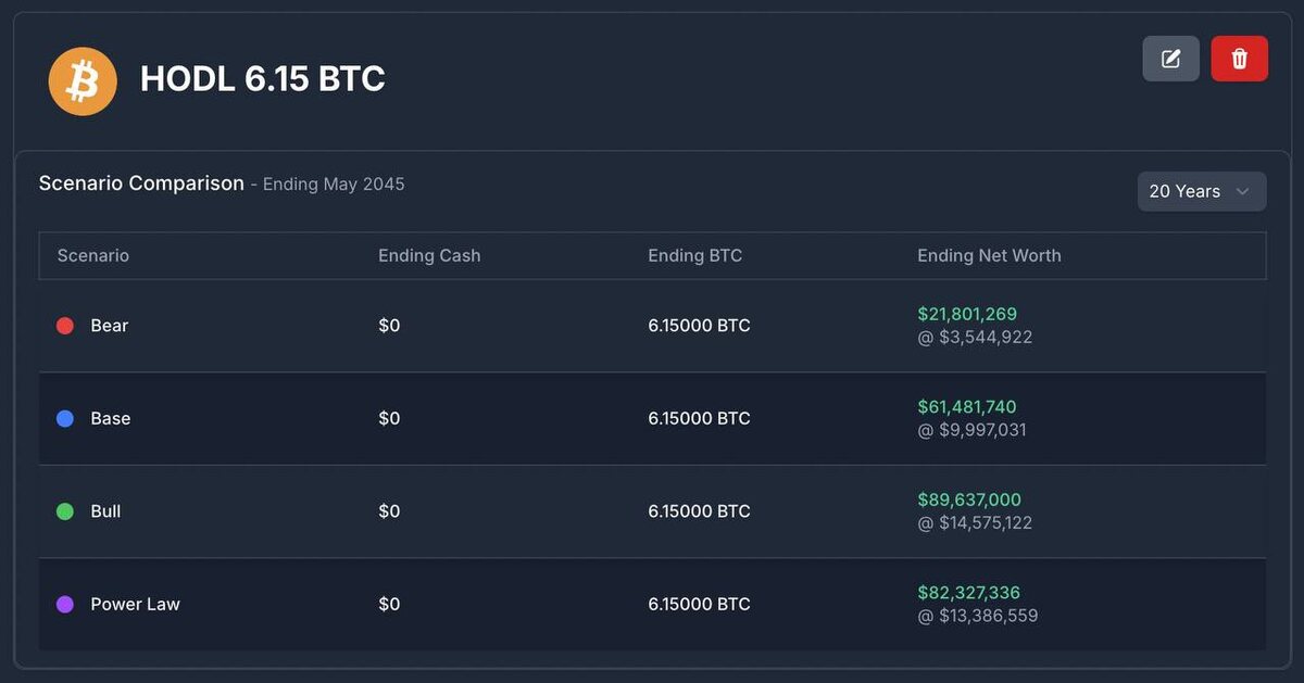 Один мудрый человек сказал: «Добери до 6.15 BTC и просто держи». Без альфы. Без тайминга. Без героизма. Просто количество. И время. Я смотрю на расчёт на 20 лет вперёд — и он странно трезвый. Базовый сценарий. Без экстремального оптимизма. 27% CAGR. В этом сценарии 6.15 BTC превращаются в ~$61 млн чистого капитала. Не потому что «биткоин улетит». А потому что время делает свою работу. Забавно, что за последние 20 лет Apple росла примерно с тем же темпом — около 29% годовых. Никто тогда не говорил: «слишком очевидно». Говорили: «уже поздно». Самое сложное здесь не купить. И даже не удержать. Самое сложное — не мешать циклу сделать свое дело. Без лишних движений. Без попыток быть умнее времени. Без психологической мясорубки на каждом откате. #bitcoin #циклы #время