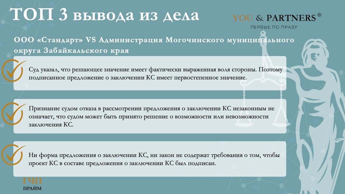 Команда You & Partners проанализировала постановление Четвертого арбитражного апелляционного суда по делу № А78-4426/2025, которое касается законности отказа органа власти от рассмотрения инициативы по заключению концессионного соглашения (КС). 🟢 Суть спора: ООО «Стандарт» (инициатор ЧКИ) направило в Администрацию Могочинского муниципального округа Забайкальского края предложение о заключении КС в отношении объектов коммунальной инфраструктуры. Администрация издала постановление об отказе в заключении КС, сославшись на то, что поступившие документы (предложение и проект КС) не были подписаны. ООО «Стандарт» обратилось в суд с требованием признать это бездействие незаконным и обязании устранить допущенные нарушения путем принятия решения о возможности заключения КС на условиях, предусмотренных предложением о заключении соглашения. Позиция сторон по делу. Истец (ООО «Стандарт»): 🤚 Требование о предварительном подписании самого проекта КС не предусмотрено законом. Эти документы носят п