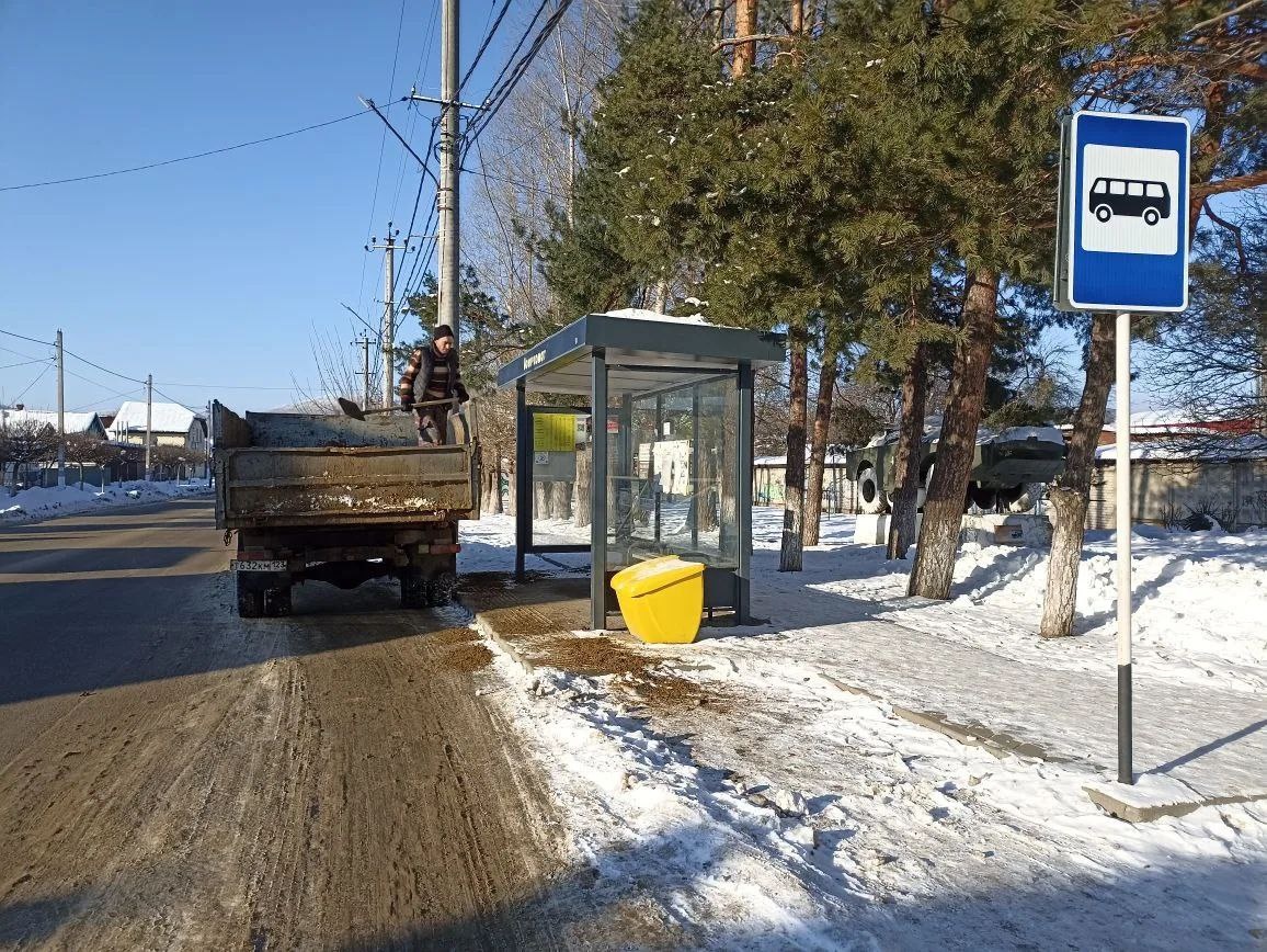Также, в условиях таяния снега и перепадов температур коммунальщики продолжают отсыпку территории остановочных пунктов общественного транспорта и пополняют запасы песка в баках.
