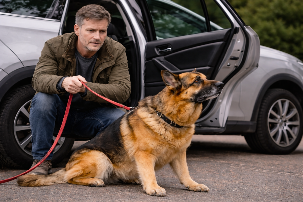 У крыльца стояла серебристая машина, вымытая до стерильного блеска. Возле пассажирской двери — мужик лет сорока восьми, тот самый концентрированный мат в куртке. Перед ним на земле — овчарка. Сидит, как вкопанная, хвостом не виляет, на машину даже не смотрит. Лапы упёрты, поводок натянут, как струна.
