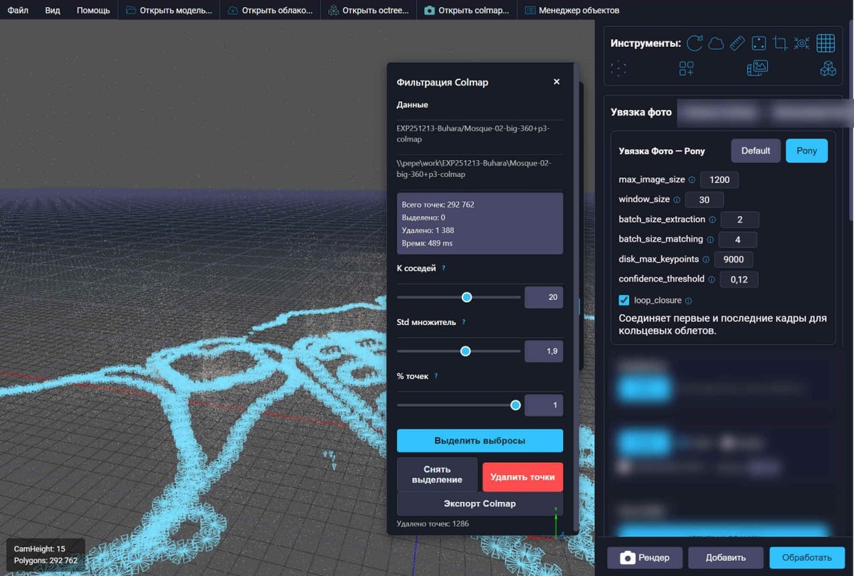 : 🌸 Увязка фотограмметрии - разработал и улучшаю алгоритм увязки на CPU+GPU. Тесты на 300-500 фото дают хороший результат за 20 минут на Intel 12700 + 4070Ti Цель - увязать 10 000 фото за 24 часа. 🌸 Фильтрация паразитных точек после увязки. Летающие артефакты всегда присутствуют, и не должны идти в обработку. Добавил алгоритм поиска паразитных точек, который до этого разработал для фильтрации облаков 3DGS. Чуть подкрутил, и можно использовать теперь для sparse point cloud. 🌸 Импорт увязки (sparse point cloud) Можно так же загрузить стороннюю увязку из Reality Scan \ Agisoft Metashape Цель - быстрое получение 3DGS