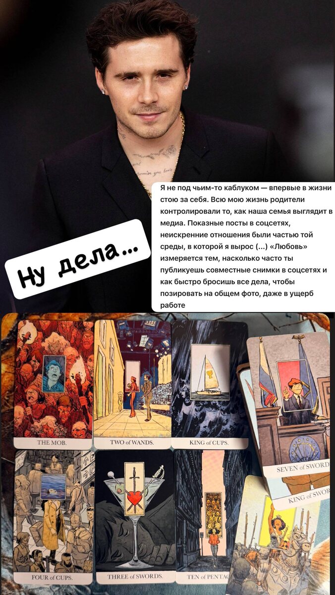 🌼Признать то, что не стал кем-то, кроме как сыном Бекхэмов, очень тяжело, но глупо уповать, что всю жизнь жил какую-то не ту жизнь (аркан Толпа). Но в этом весь Бруклин—«раненный», несчастный сын. Вопрос: а с остальными тремя детьми что тогда? 🐈🐈🐈Короче, девочки и мальчики, все, что он несет по факту правдиво только с его субъективного взгляда (Король мечей, 7 мечей), ведь до встречи с роковухой Пельц всех всё устраивало. Родители своего корзиночки, конечно, сейчас в шоках (4 кубков), его «сор из избы» про платья и прочую лабуду — удар ниже пояса (3 мечей). 🤩И кто при этом выносит личное в публичное Бруклин безусловно «незрелый плод» своих родителей, и может, как первый блин, вышел комом, но они его все равно любят и не оставят (10 пентаклей), а вот с Николой Пельц время покажет👌