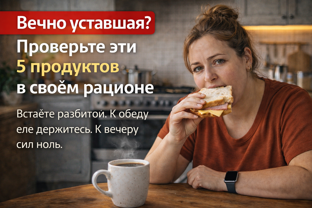 Встаёте разбитой. К обеду еле держитесь. К вечеру сил ноль. И все говорят: "Высыпайся больше", "Отдохни", "Витаминки попей". А вы уже и спите по 8 часов, и выходные лежите. А усталость никуда не уходит. Вот что интересно: часто дело не в количестве сна. А в том, что вы едите. Есть продукты, которые буквально высасывают энергию из организма. Вы их едите каждый день и не понимаете, почему так устали. Давайте разберём 5 главных энергетических воров. Уберите их — и почувствуете разницу уже через неделю. Что происходит: Вы съели круассан с кофе. Сахар в крови взлетел. Инсулин выбросился. Через час — резкий спад. Результат? Упадок сил, туман в голове, хочется ещё кофе или сладкого. Это не про калории. Это про скачки глюкозы, которые изматывают нервную систему. К обеду вы уже выжаты. Что делать? Замените на белковый завтрак: яйца, творог, греческий йогурт. Энергия будет стабильной до обеда. "Я ем обезжиренный творог, лёгкий йогурт, куриную грудку без жира". Звучит правильно? На деле — это пря