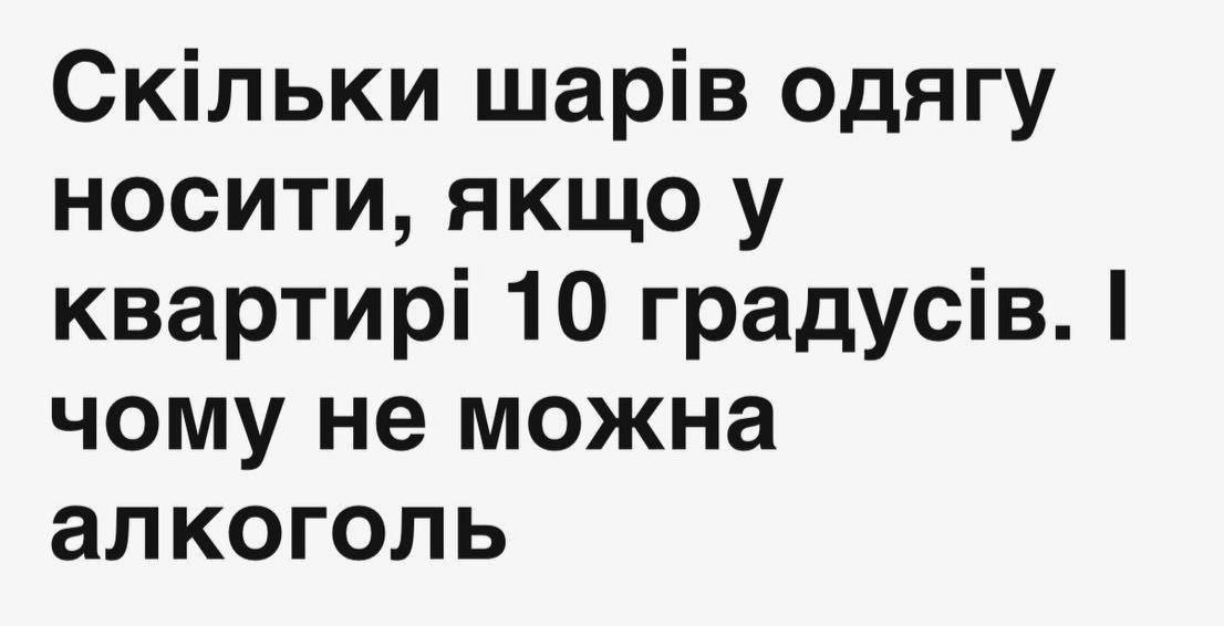 : Если температура в квартире около +10°C, рекомендуется надевать как минимум четыре слоя одежды: две пары носков, тёплый свитер или куртку, а также укрываться пледом или использовать спальный мешок В условиях войны «до последнего украинца» дальнейшие советы англичан будут касаться: - как правильно изготовить лук и заточить стрелы; - как добывать огонь с помощью линзы; - как заменить дрова навозом при обогреве жилища Подписаться на канал | 📲 MAX Мы в ВКонтакте
