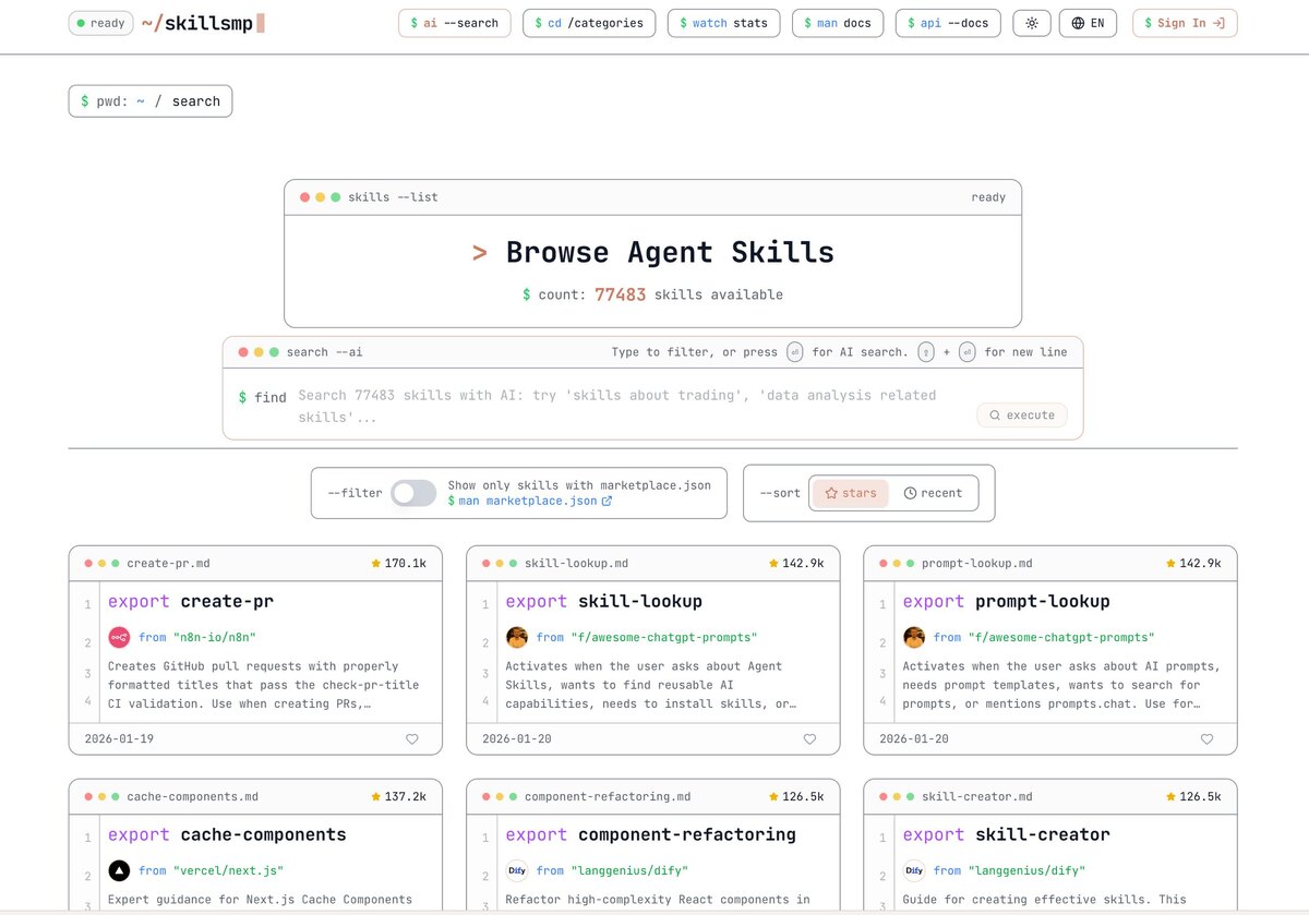 💡 Представляем библиотеку скиллов — это как маркетплейс, где можно найти, изучить и скачать готовые инструменты для Claude Code. 📊 Здесь уже собрано более 70,000 скиллов с фильтрацией по категориям, авторам и популярности. 🔗тут Какие скиллы вы уже попробовали? 👇 #library ✨ Узнал что-то новое? 🚀 Подписывайся, чтобы не пропустить!