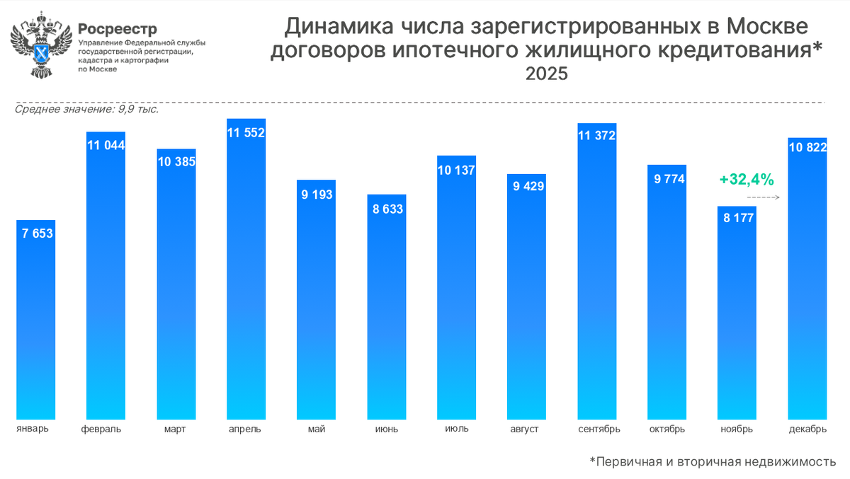 «В рамках “Семейной ипотеки” в столице в январе-декабре 2025 года выдано 586 миллиардов рублей – это 18,6% от общероссийского уровня в рамках данной программы и 18,1% от всех льготных ипотечных займов по стране. Всего в городе с начала действия программ выдано таких кредитов более чем на 3,3 триллиона рублей», – сказал он. За 12 месяцев 2025 года Управлением Росреестра по Москве зарегистрирован 118 171 договор ипотечного жилищного кредитования на первичном и вторичном рынках недвижимости. Динамика к 2024 году составила -2,2%. В декабре 2025 года в столице зарегистрировано 10 822 договора жилищной ипотеки – к ноябрю (8 177) показатель увеличился на треть (32,4%). При этом в годовом выражении результат декабря 2025 года уступил 3,7% аналогичному месяцу 2024 года, но на 12% превзошел последний месяц 2023 года (9 664). «Однако общий тренд все же смещается в сторону охлаждения спроса, а декабрьский рост показателя скорее создан “нетерпеливым” покупателем, не отражая реальной картины рынка.
