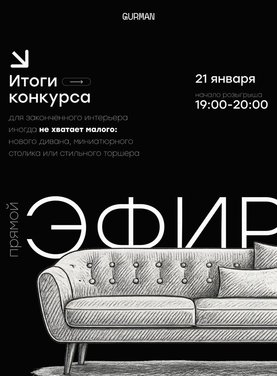 ✨ Мы наконец преодолели рубеж – середина января позади. Это значит, что на увеличение идет не только световой день, но и число подписчиков в нашем телеграмм-канале. 📊 А все почему? Все потому, что ровно месяц назад мы запустили конкурс совместно с divan.by с аппетитными призовыми для “сбалансированного интерьера”. Такое чувство, будто разыгрываем комплексный обед… На 1-е у нас идет мягкий диван, вторым курсом – торшер, а в качестве десерта подаем стильный журнальный столик. 🎁 Пришло время узнать победителей в конкурсе! 🏆 ‼️Прямо здесь с 19:00 до 20:00 прямой эфир проведет наш харизматичный, энергичный и просто необъятный руководитель GURMAN Артем Тарасенко. Счастливчиков будем определять с помощью генератора случайных чисел. Готовы? 🔥