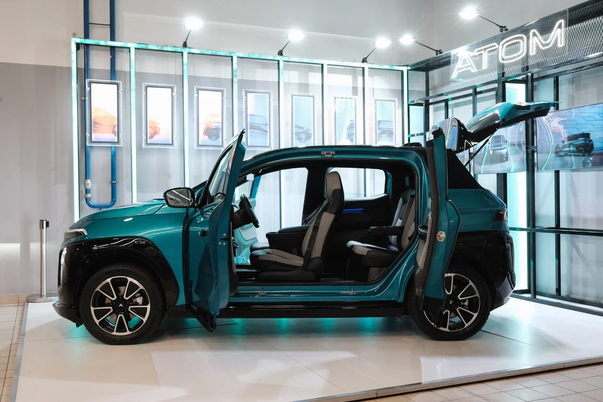 Под маркой «Атом» планируется выпускать компактные электромобили собственной разработки. Интересная особенность машины — распашные двери и отсутствие центральной стойки. Интерьер отличается предельным минимализмом: гладкая передняя панель полностью лишена кнопок и экранов. Все элементы управления сосредоточены на руле — там находятся сенсорный дисплей и клавиши основных функций. Автомобиль «Атом» планируется оснастить электромотором и аккумуляторной батареей отечественного производства. Точные технические характеристики пока не раскрыты, однако уже известно, что двигатель будет установлен на задней оси. Предполагаемый запас хода на одном заряде составляет 500 км. Автомобиль «Атом» оснащён продвинутым комплексом систем помощи водителю (ADAS) второго уровня. Для ориентации в пространстве машина использует девять камер, пять радаров и 12 ультразвуковых сенсоров