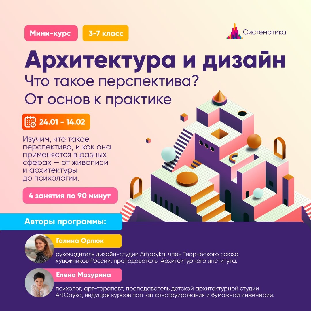 Мы разработали годовую программу обучения. Её ключевая особенность — неразрывная связь теории и практики: полученные знания сразу применяются в работе над реальными проектами. Это помогает не только глубже освоить предмет, но и сформировать хорошее творческое портфолио, наполненное разнообразными и продуманными работами. Программа разбита на 12 модулей по 4 занятия в каждом. Вы можете пройти все 12 модулей, а можете выбрать только те темы, которые вам интересны. ➖Итог по каждому модулю — завершённая работа и диплом ➖По окончании года — финальный диплом о прохождении полного курса Посмотрите, какая объемная и последовательная программа обучения в этом году . 3 первых уже прошли ⬇️ ✅1 модуль. Архитектура. Бионика ✅2 модуль. Композиция. Основы формирования ✅3 модуль. Архитектура. Объёмно-пространственная композиция 4 модуль. Что такое перспектива? От основ к практике. Старт 24 января 5 модуль. Архитектура мира 6 модуль. Дизайн интерьера 7 модуль. Графический дизайн: орнамент, узор и р
